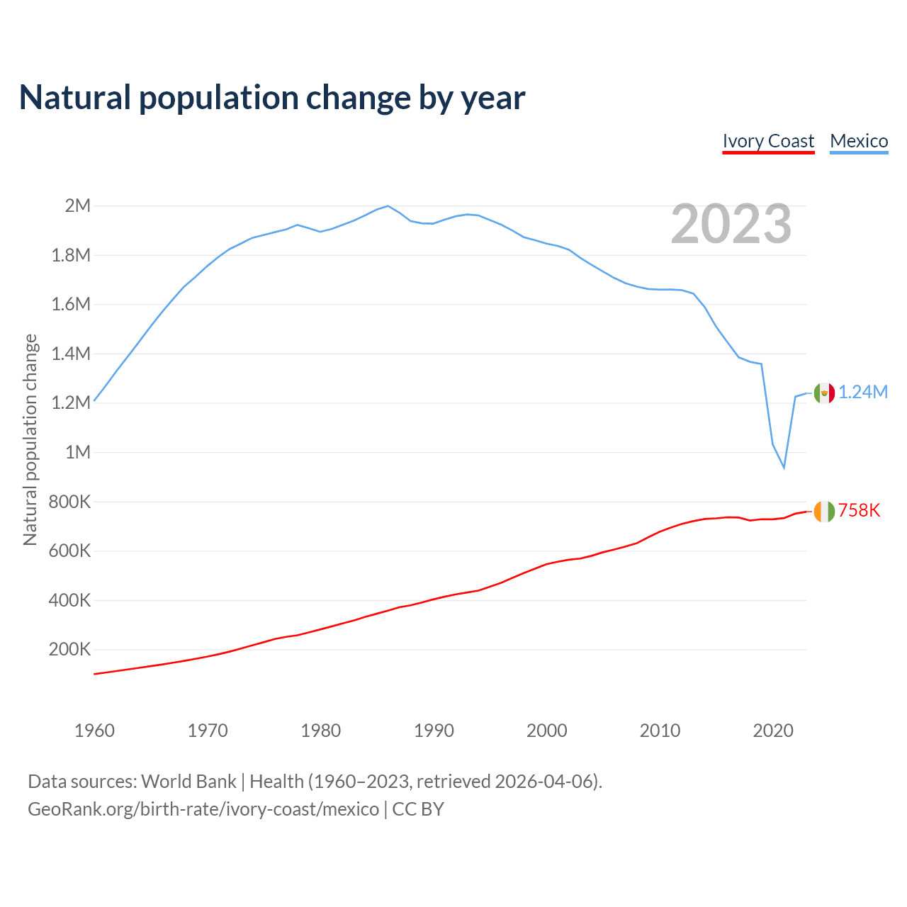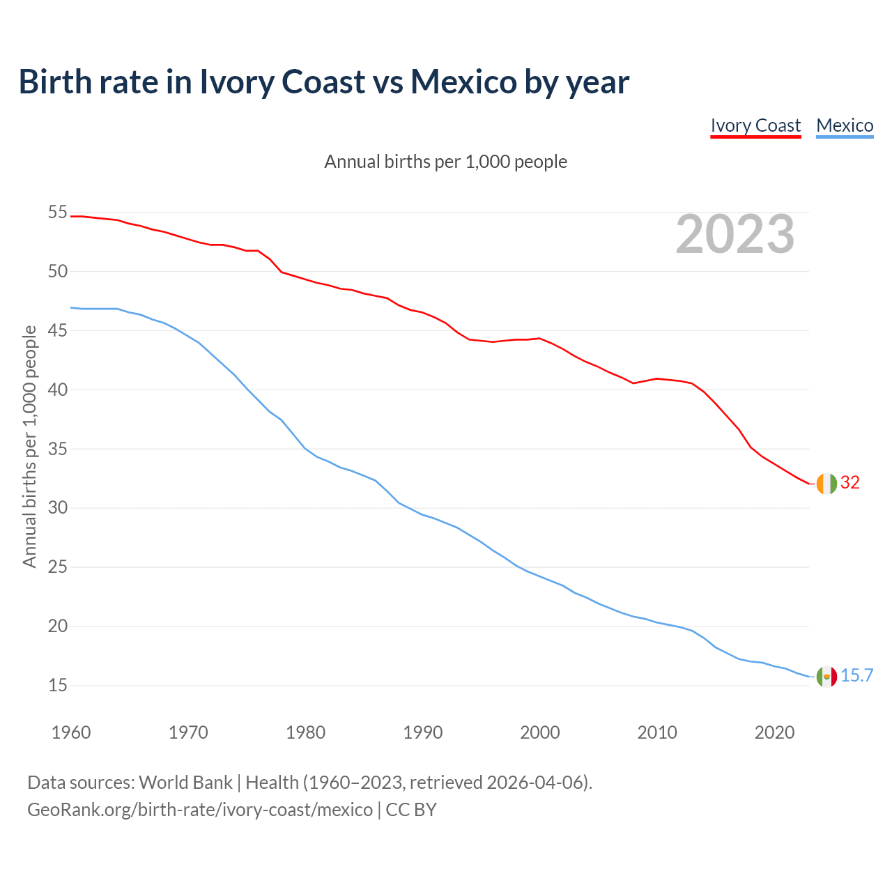 Ivory Coast has an annual birth rate of 32 births per 1,000 people, compared to 15.7 for Mexico. The average number of children a woman is expected to have during her lifetime — the fertility rate, is 4.28 in Ivory Coast and 1.91 in Mexico — 55.4% difference.