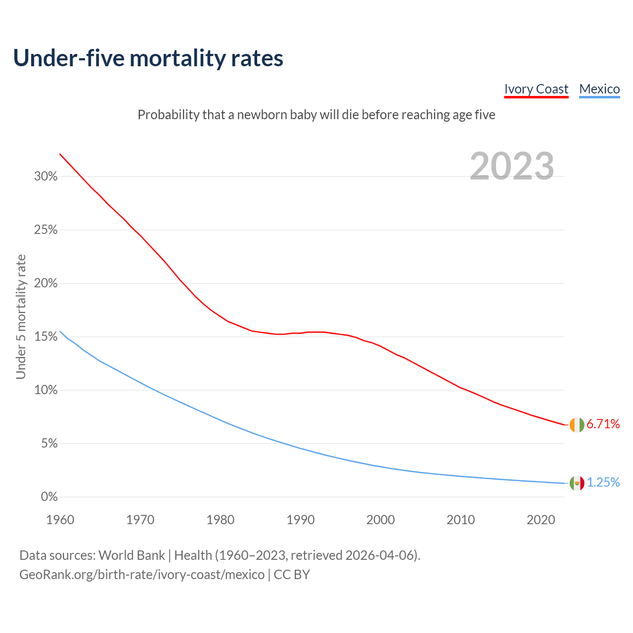 The chance that a newborn baby will die before reaching age five is 6.71% in Ivory Coast and 1.25% in Mexico. Above is a chart with historical data on under-five mortality rates.