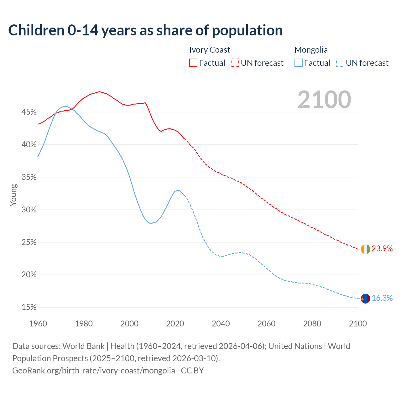Ivory Coast has an annual birth rate of 32 births per 1,000 people, compared to 19 for Mongolia. The average number of children a woman is expected to have during her lifetime — the fertility rate, is 4.28 in Ivory Coast and 2.7 in Mongolia — 37% difference.