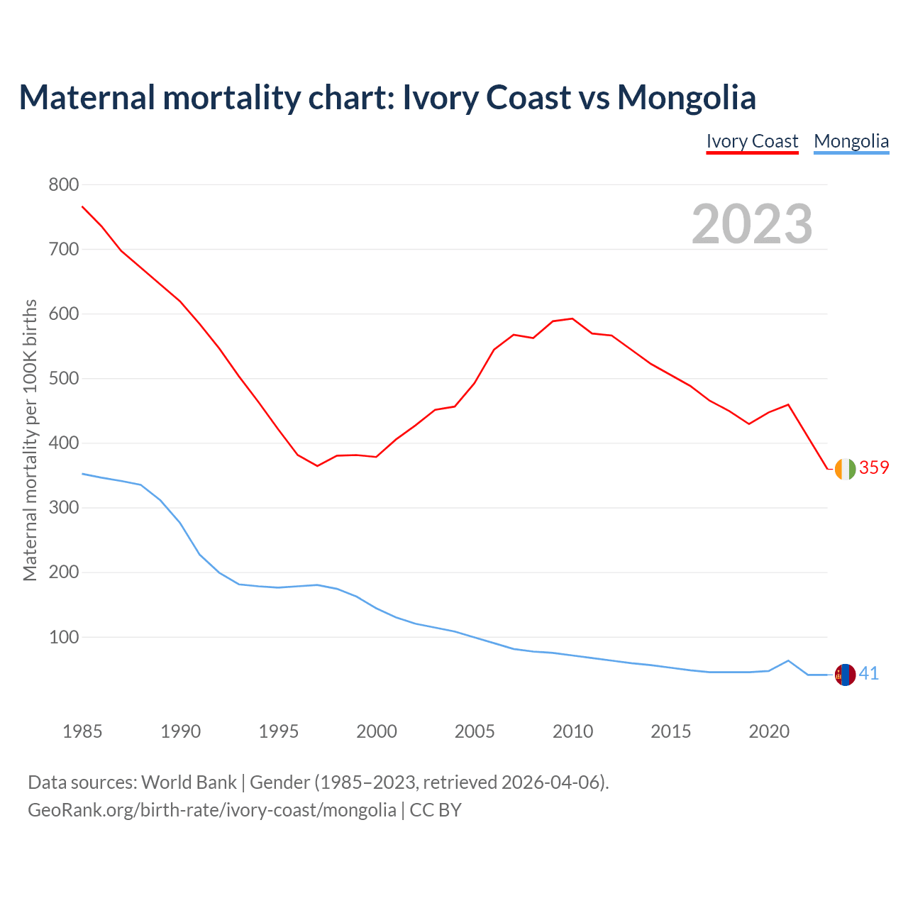 The maternal mortality rate, which is the probability of dying during childbirth or within 42 days of pregnancy termination, is 359 deaths per 100,000 live births in Ivory Coast, compared to 41 deaths in Mongolia.