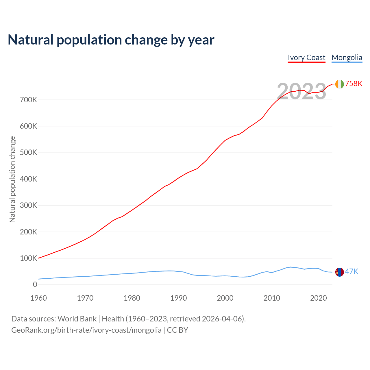 According to the latest available data on birth rates, the fertility rate in Ivory Coast was 4.28 children per woman in 2023, compared to 2.7 in Mongolia in 2023. The replacement level is considered to be 2.1 children per woman.