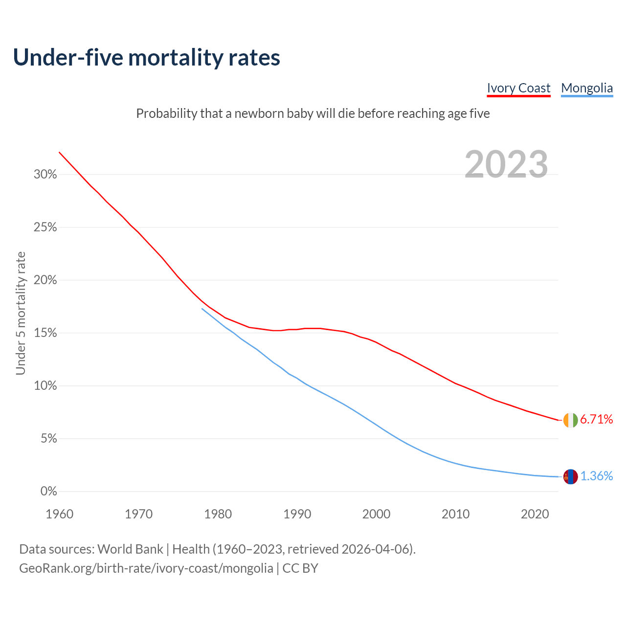 The chance that a newborn baby will die before reaching age five is 6.71% in Ivory Coast and 1.36% in Mongolia. Above is a chart with historical data on under-five mortality rates.