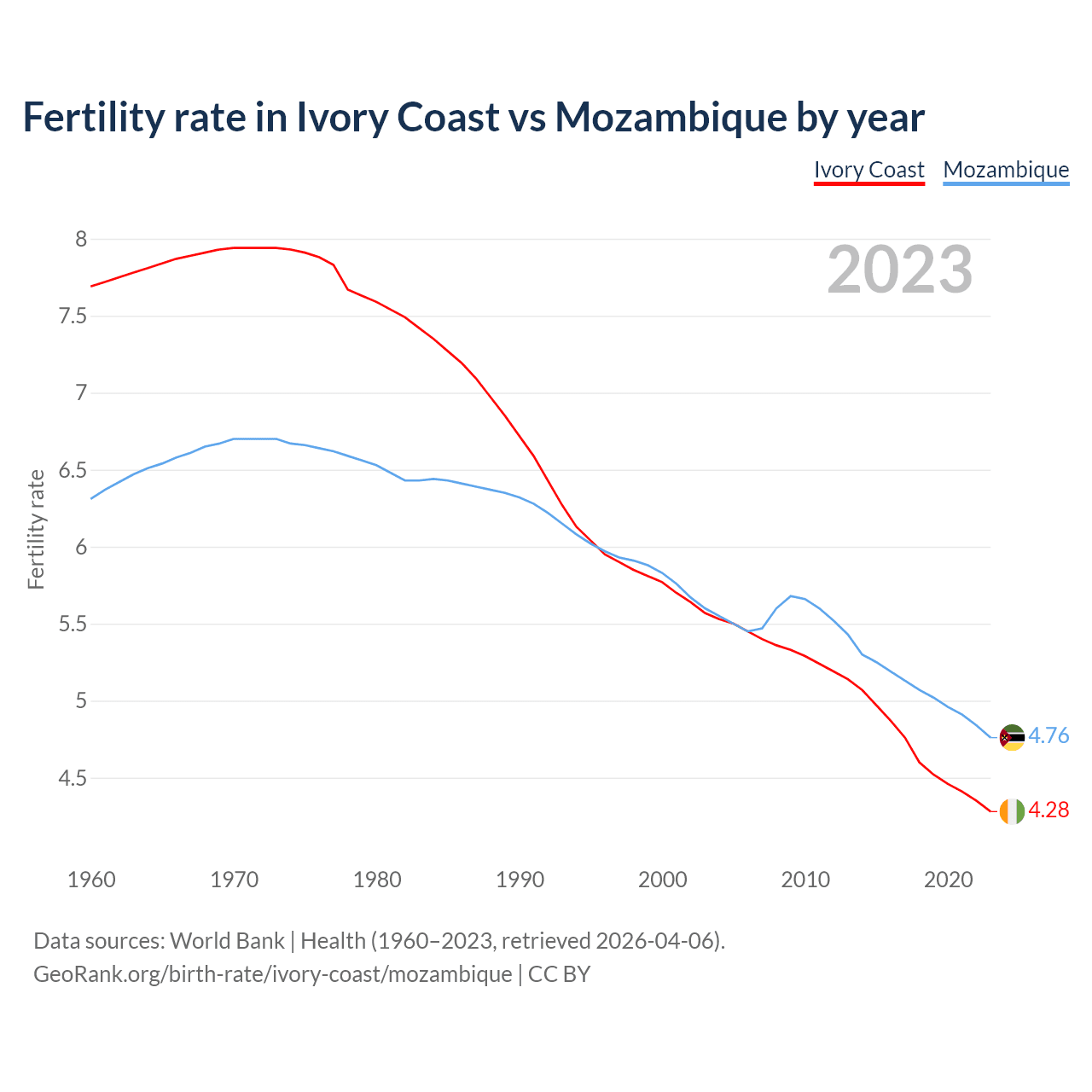 1960 vs 2023, the fertility rate has decreased by 44.3% in Ivory Coast and by 24.5% in Mozambique — in 1960, it was 7.69 and 6.31, respectively.