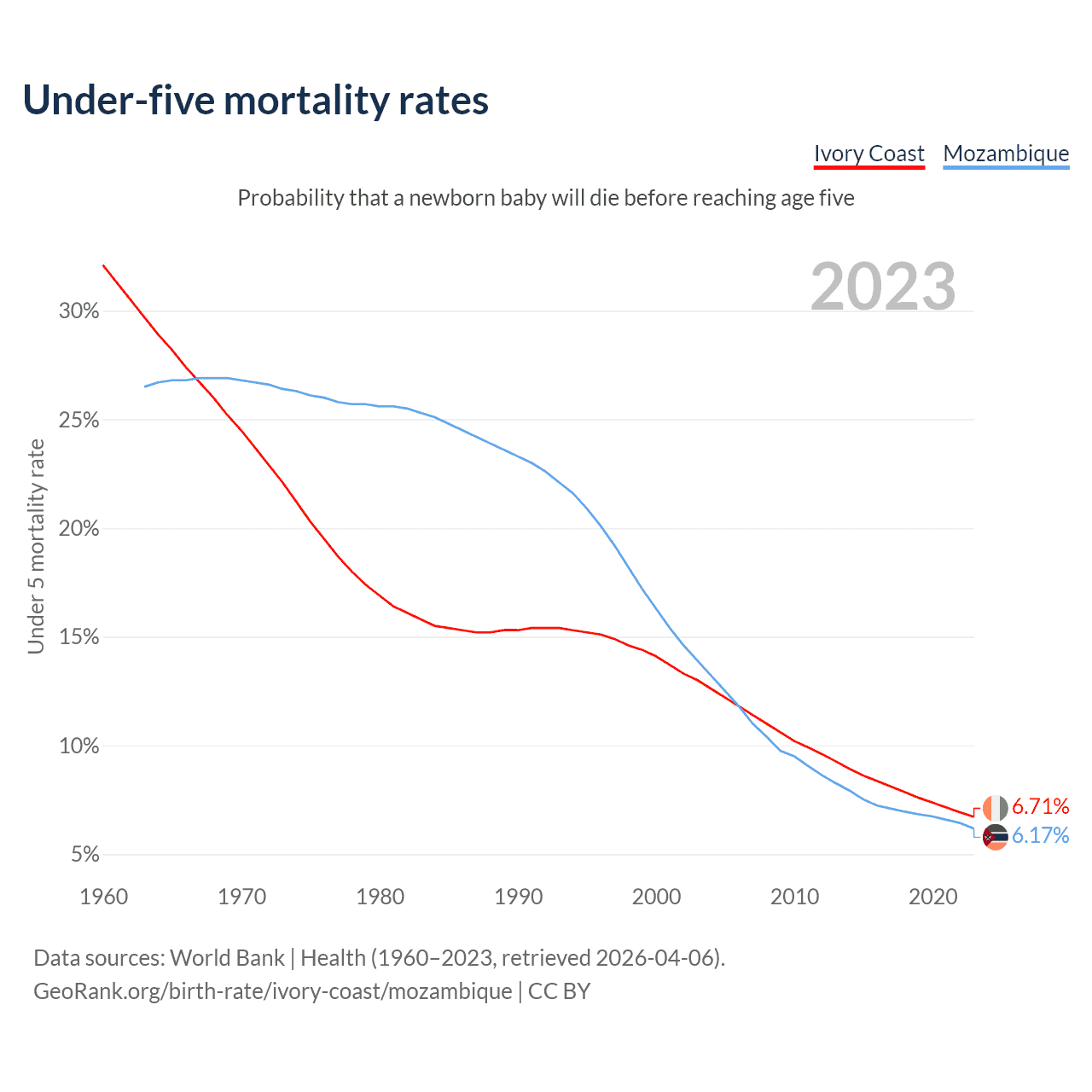 The chance that a newborn baby will die before reaching age five is 6.71% in Ivory Coast and 6.17% in Mozambique. Above is a chart with historical data on under-five mortality rates.