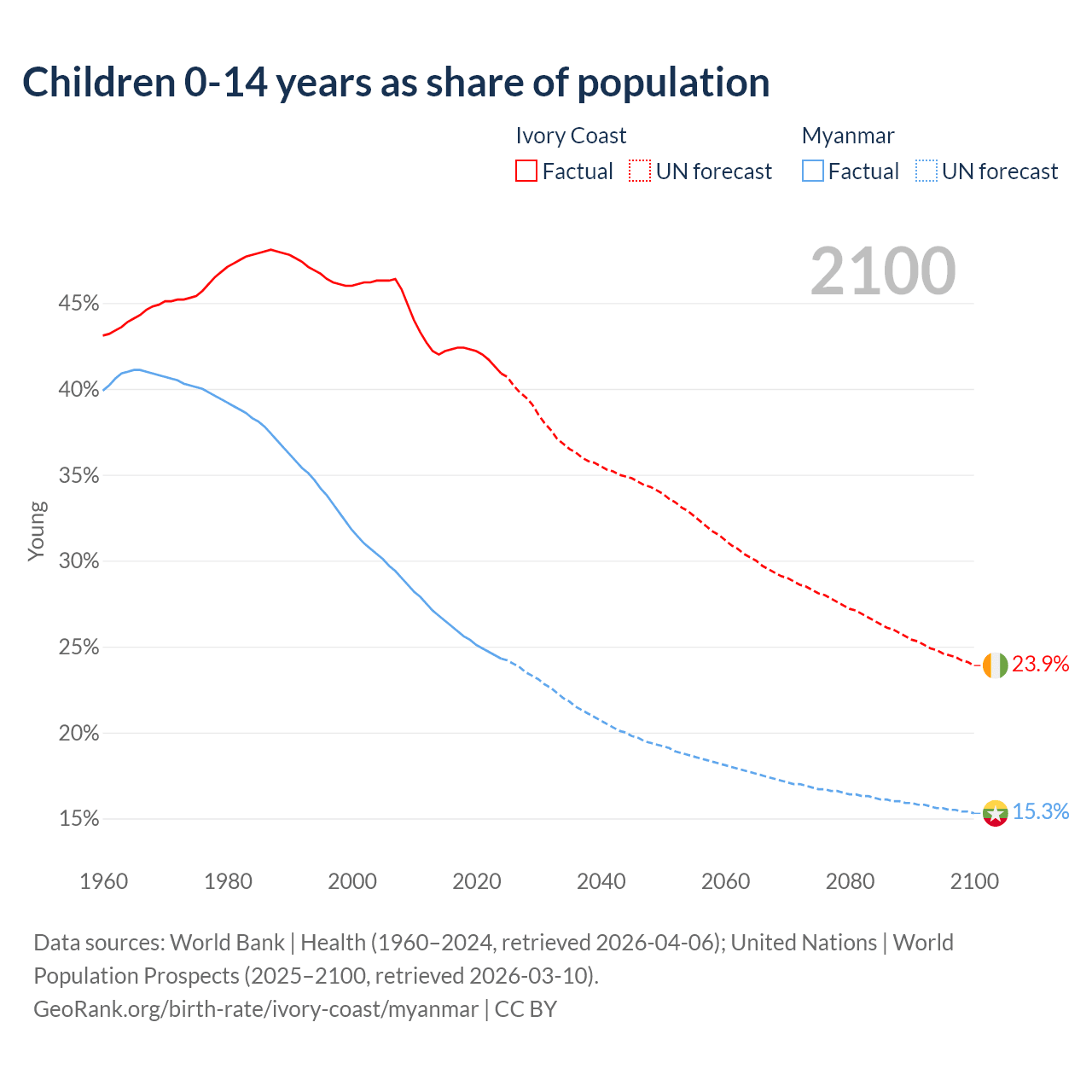 Ivory Coast has an annual birth rate of 32 births per 1,000 people, compared to 16.7 for Myanmar. The average number of children a woman is expected to have during her lifetime — the fertility rate, is 4.28 in Ivory Coast and 2.12 in Myanmar — 50.6% difference.