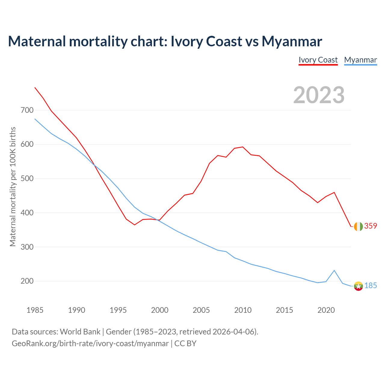 The maternal mortality rate, which is the probability of dying during childbirth or within 42 days of pregnancy termination, is 359 deaths per 100,000 live births in Ivory Coast, compared to 185 deaths in Myanmar.