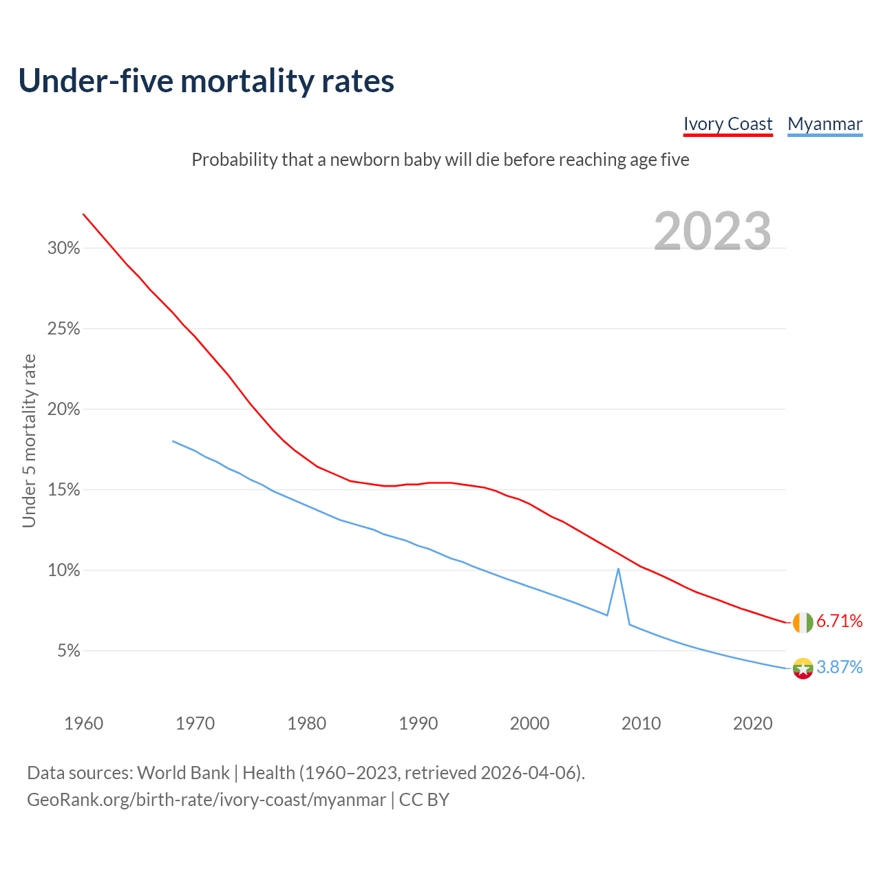 The chance that a newborn baby will die before reaching age five is 6.71% in Ivory Coast and 3.87% in Myanmar. Above is a chart with historical data on under-five mortality rates.