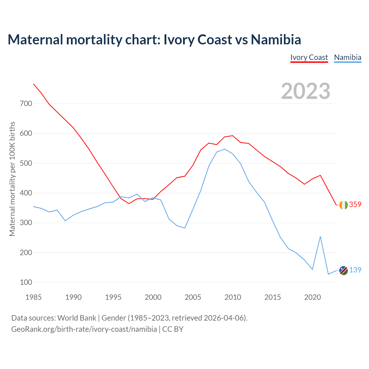 The maternal mortality rate, which is the probability of dying during childbirth or within 42 days of pregnancy termination, is 359 deaths per 100,000 live births in Ivory Coast, compared to 139 deaths in Namibia.