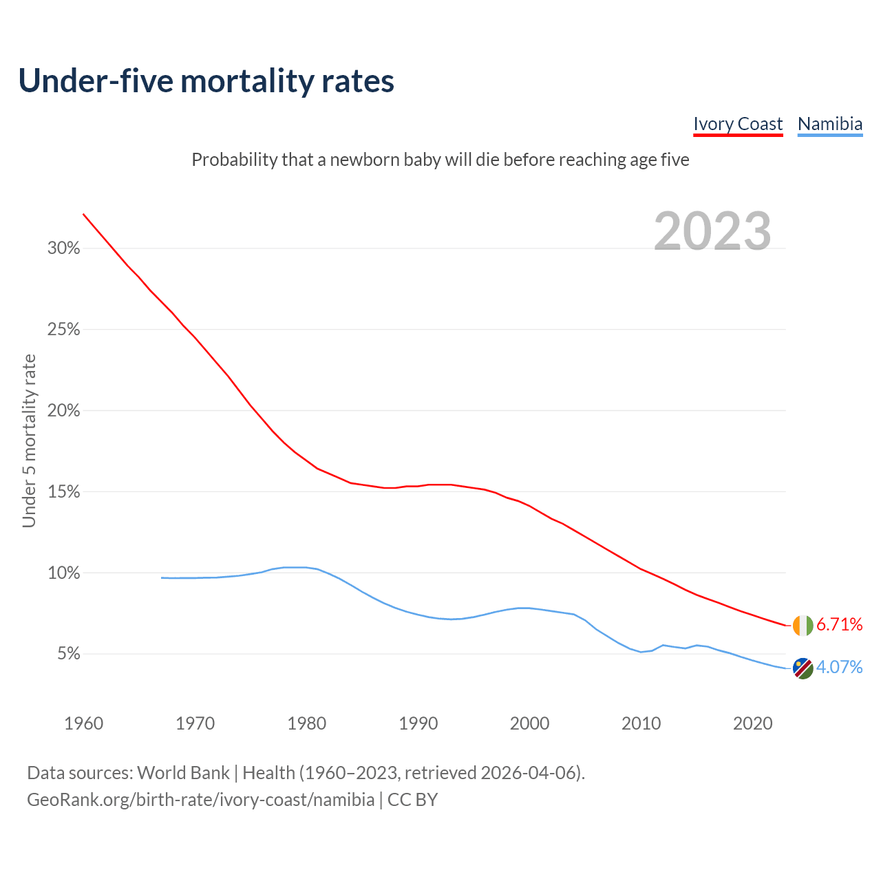 The chance that a newborn baby will die before reaching age five is 6.71% in Ivory Coast and 4.07% in Namibia. Above is a chart with historical data on under-five mortality rates.