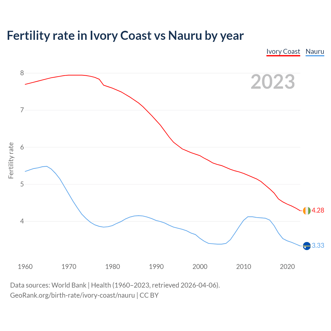1960 vs 2023, the fertility rate has decreased by 44.3% in Ivory Coast and by 37.6% in Nauru — in 1960, it was 7.69 and 5.34, respectively.
