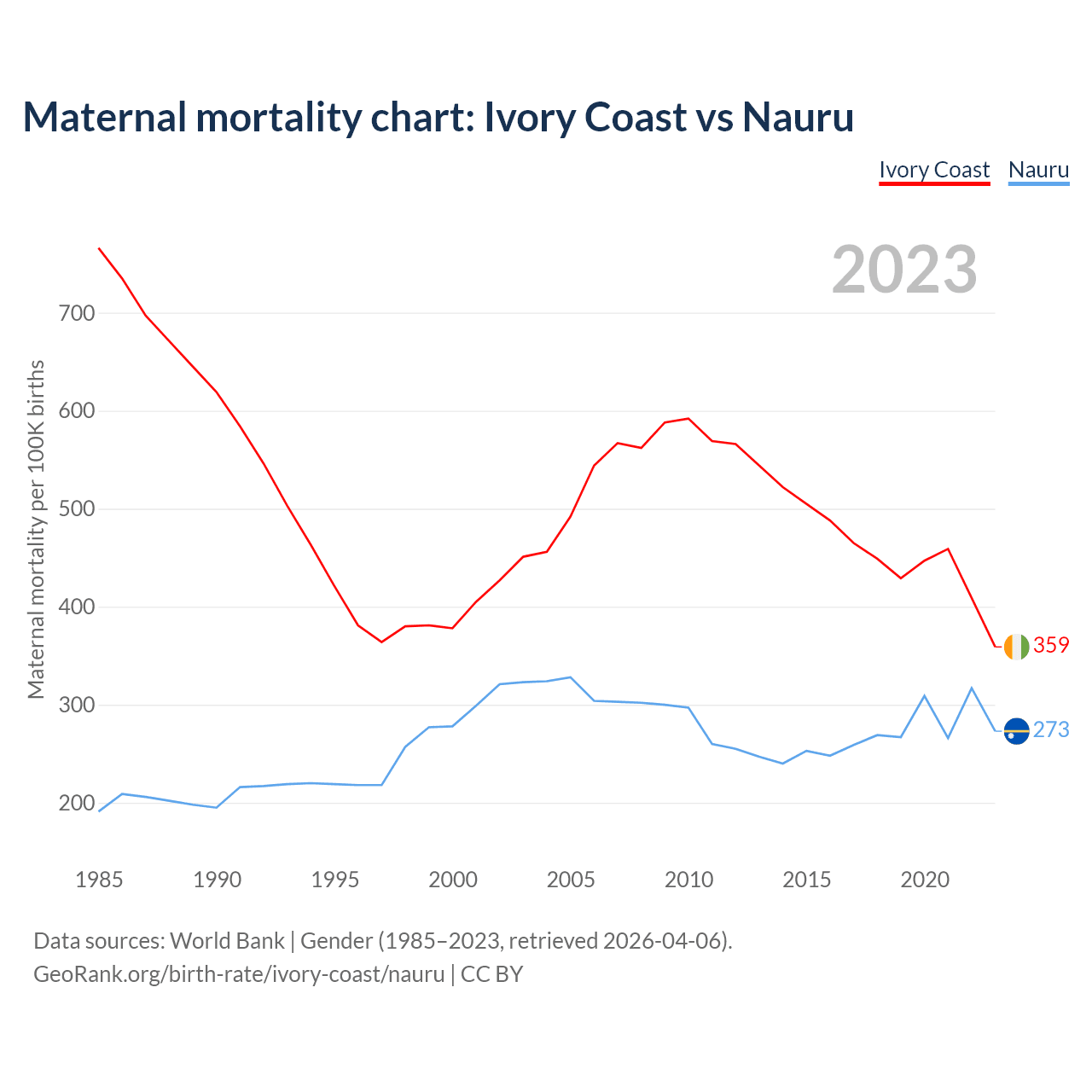 The maternal mortality rate, which is the probability of dying during childbirth or within 42 days of pregnancy termination, is 359 deaths per 100,000 live births in Ivory Coast, compared to 273 deaths in Nauru.