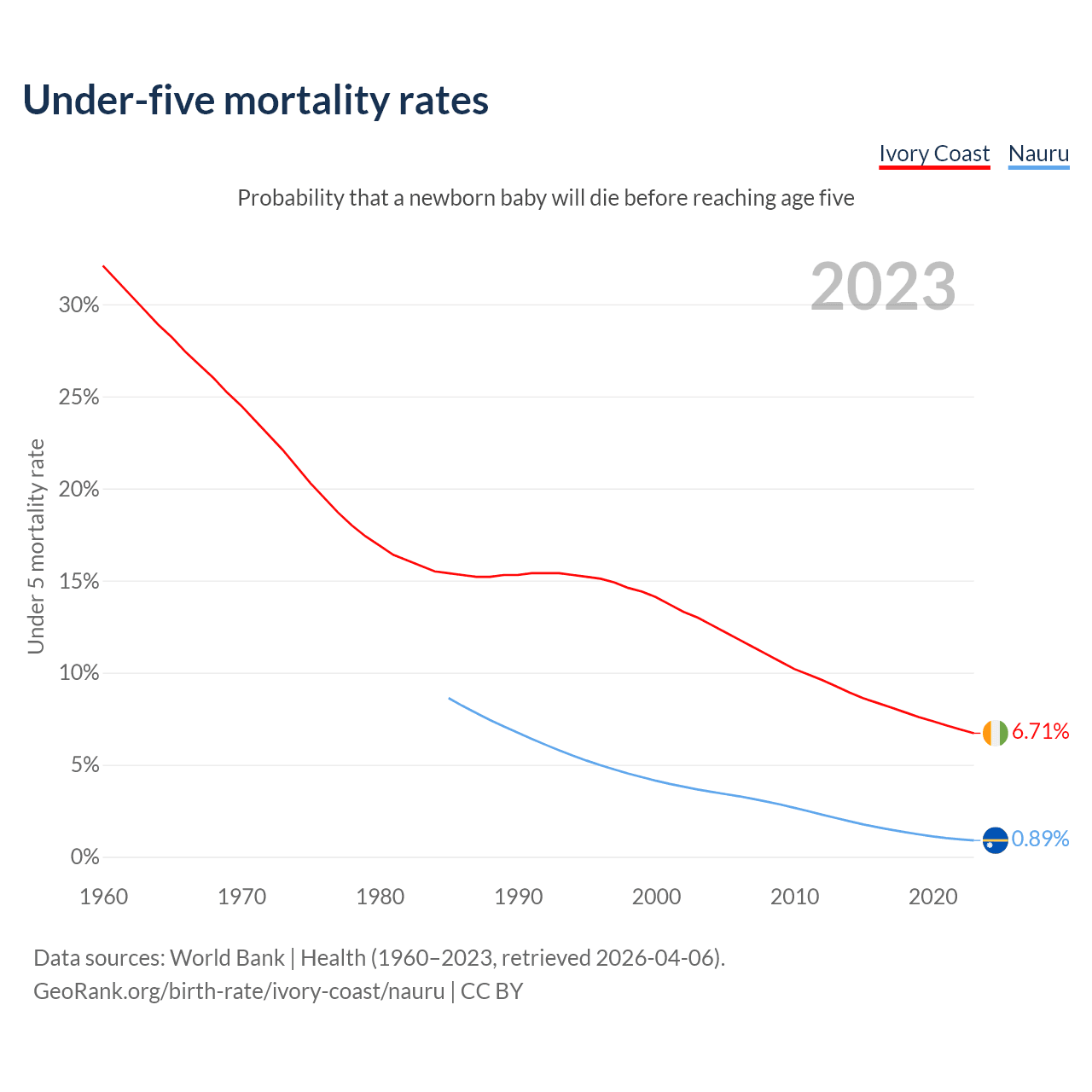 The chance that a newborn baby will die before reaching age five is 6.71% in Ivory Coast and 0.89% in Nauru. Above is a chart with historical data on under-five mortality rates.