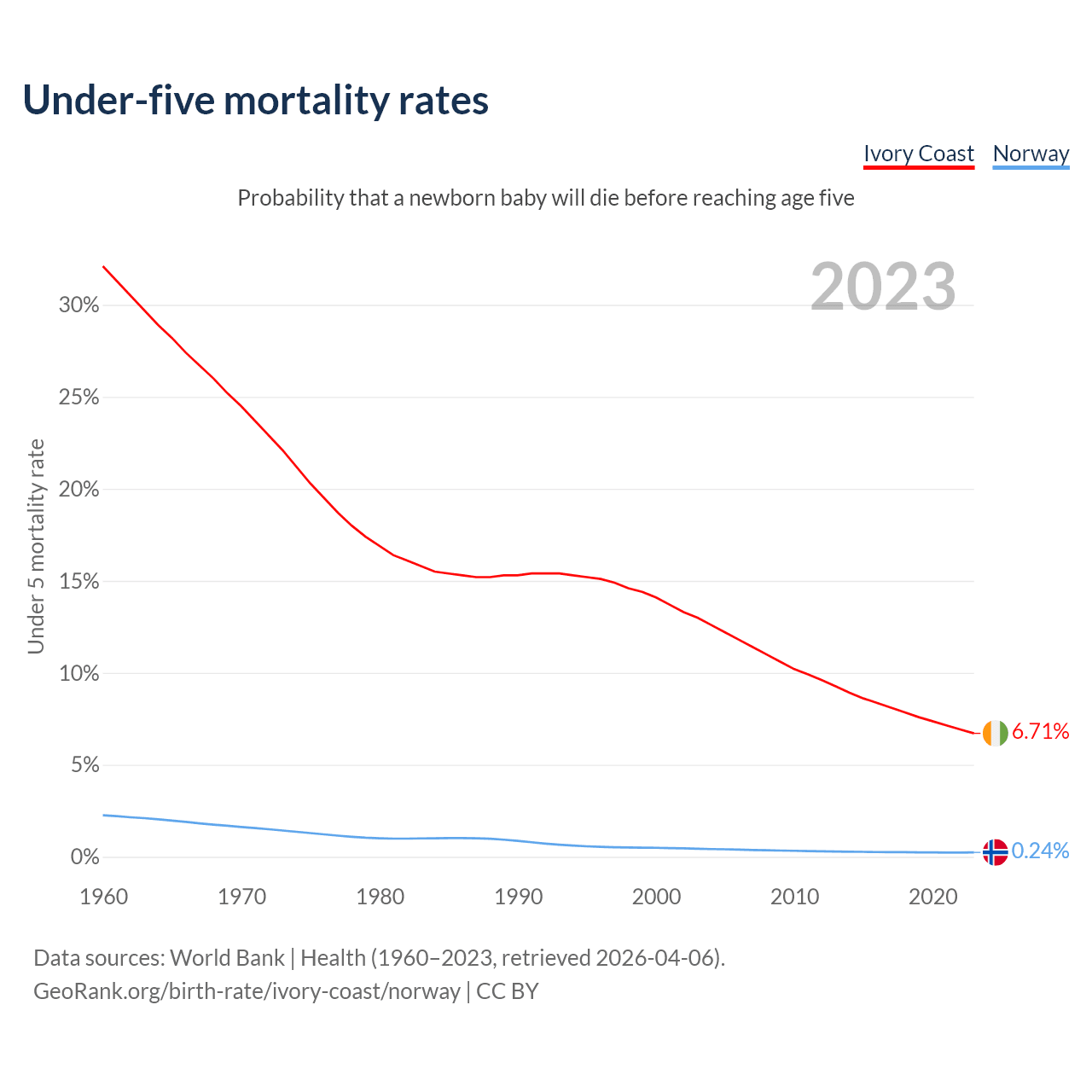 The chance that a newborn baby will die before reaching age five is 6.71% in Ivory Coast and 0.24% in Norway. Above is a chart with historical data on under-five mortality rates.