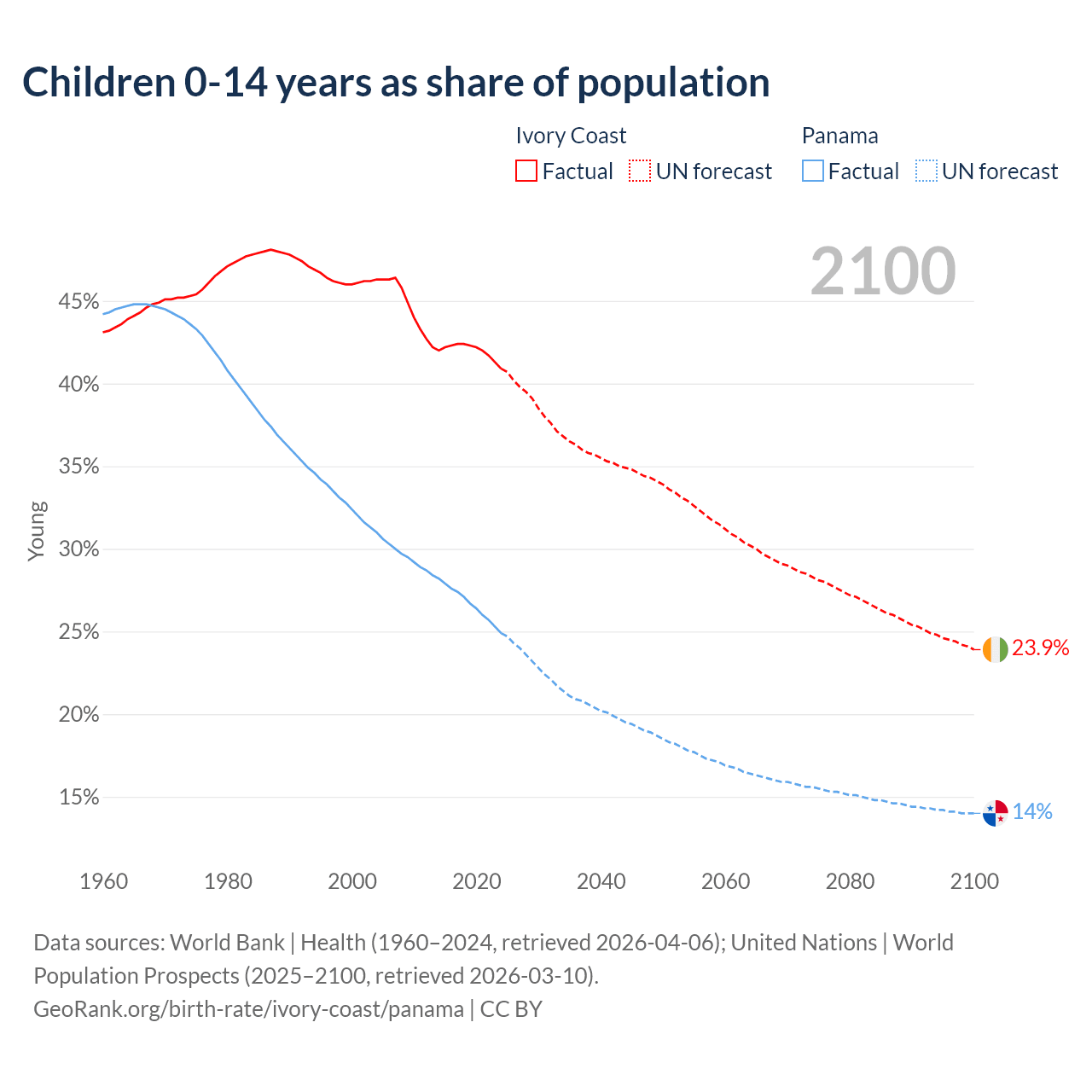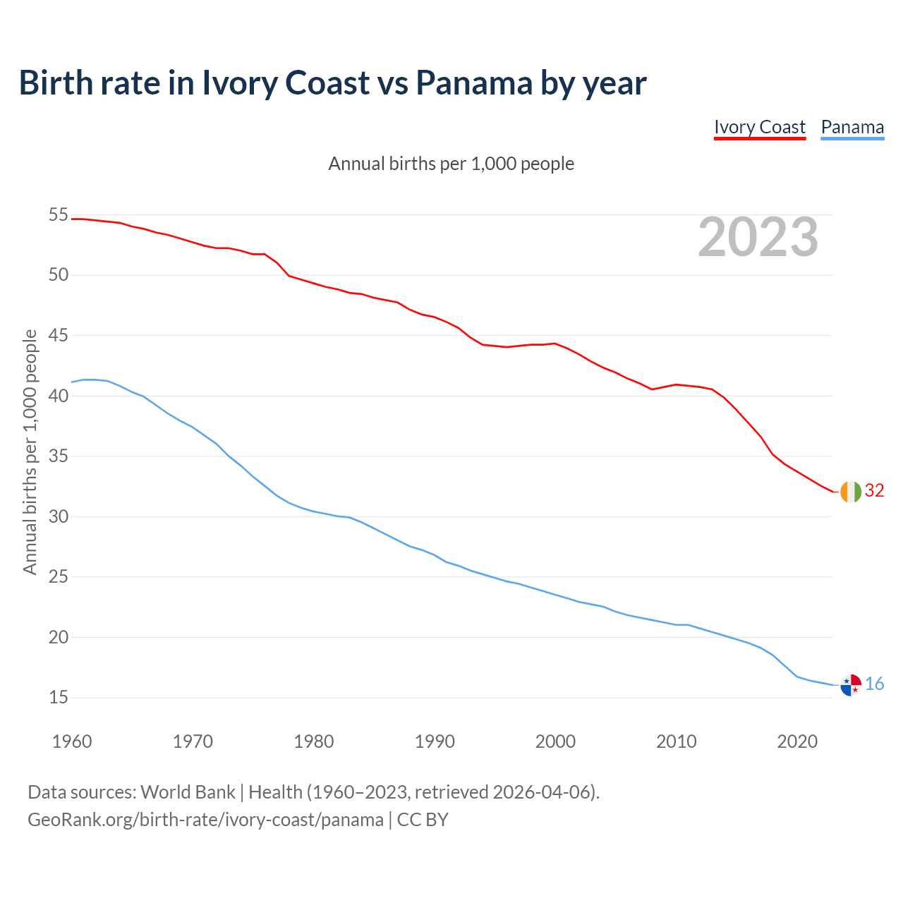 Ivory Coast has an annual birth rate of 32 births per 1,000 people, compared to 16 for Panama. The average number of children a woman is expected to have during her lifetime — the fertility rate, is 4.28 in Ivory Coast and 2.12 in Panama — 50.5% difference.