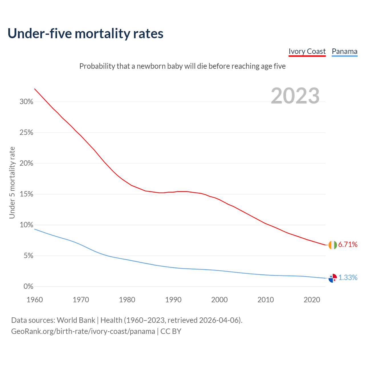 The chance that a newborn baby will die before reaching age five is 6.71% in Ivory Coast and 1.33% in Panama. Above is a chart with historical data on under-five mortality rates.