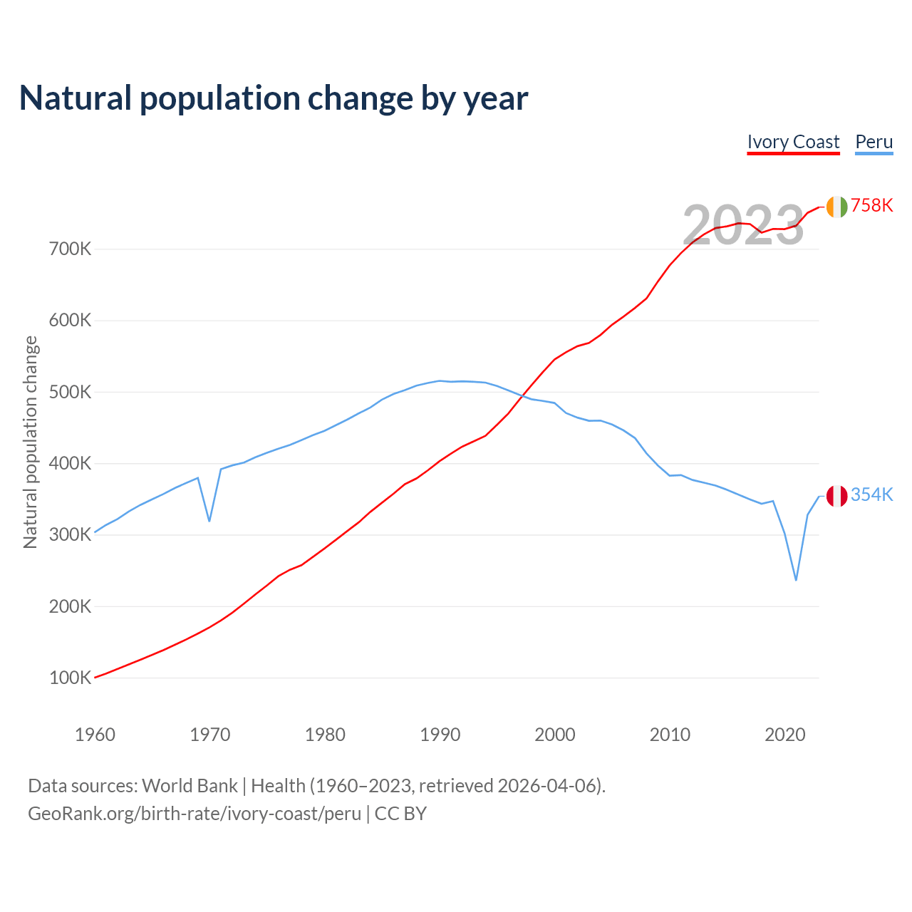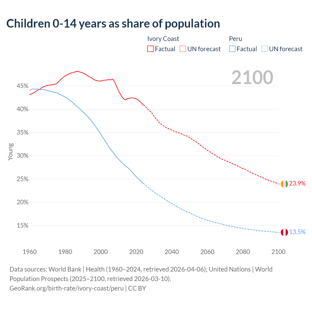 Ivory Coast has an annual birth rate of 32 births per 1,000 people, compared to 15.9 for Peru. The average number of children a woman is expected to have during her lifetime — the fertility rate, is 4.28 in Ivory Coast and 1.98 in Peru — 53.8% difference.