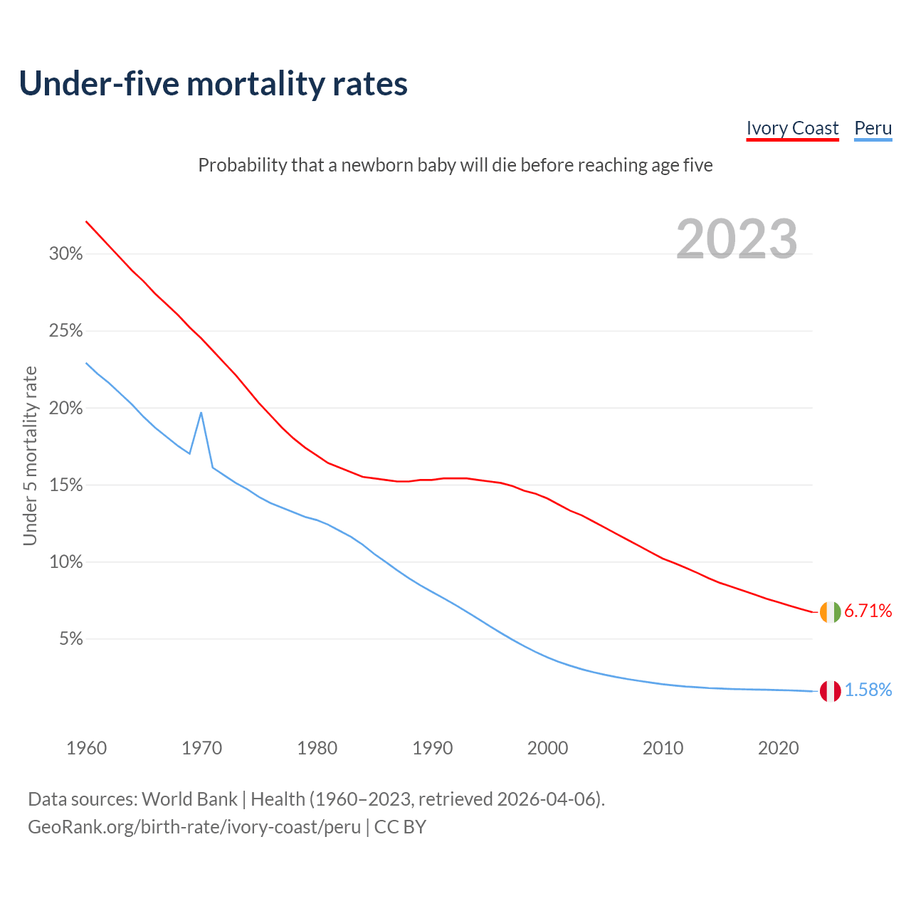 The chance that a newborn baby will die before reaching age five is 6.71% in Ivory Coast and 1.58% in Peru. Above is a chart with historical data on under-five mortality rates.