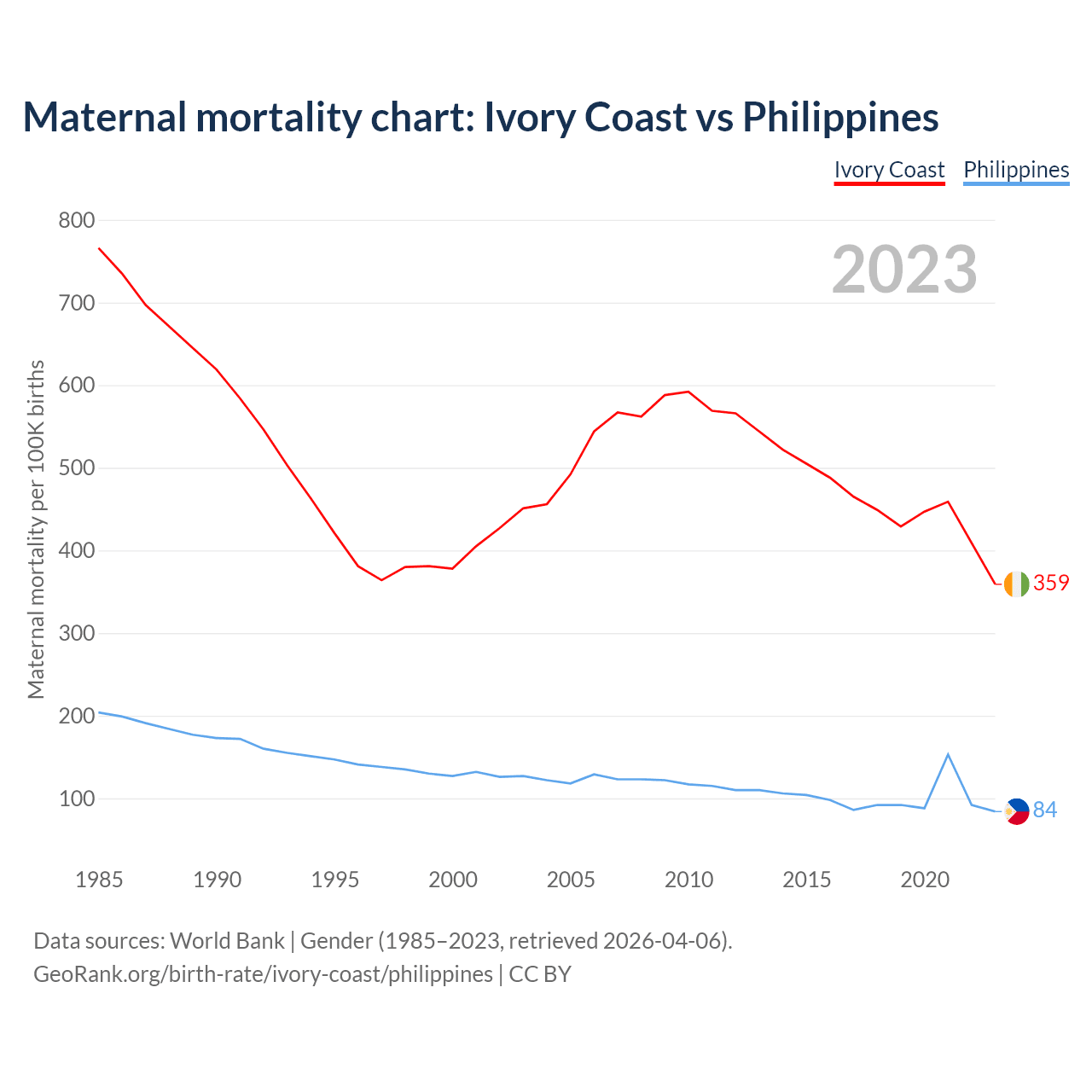 The maternal mortality rate, which is the probability of dying during childbirth or within 42 days of pregnancy termination, is 359 deaths per 100,000 live births in Ivory Coast, compared to 84 deaths in the Philippines.