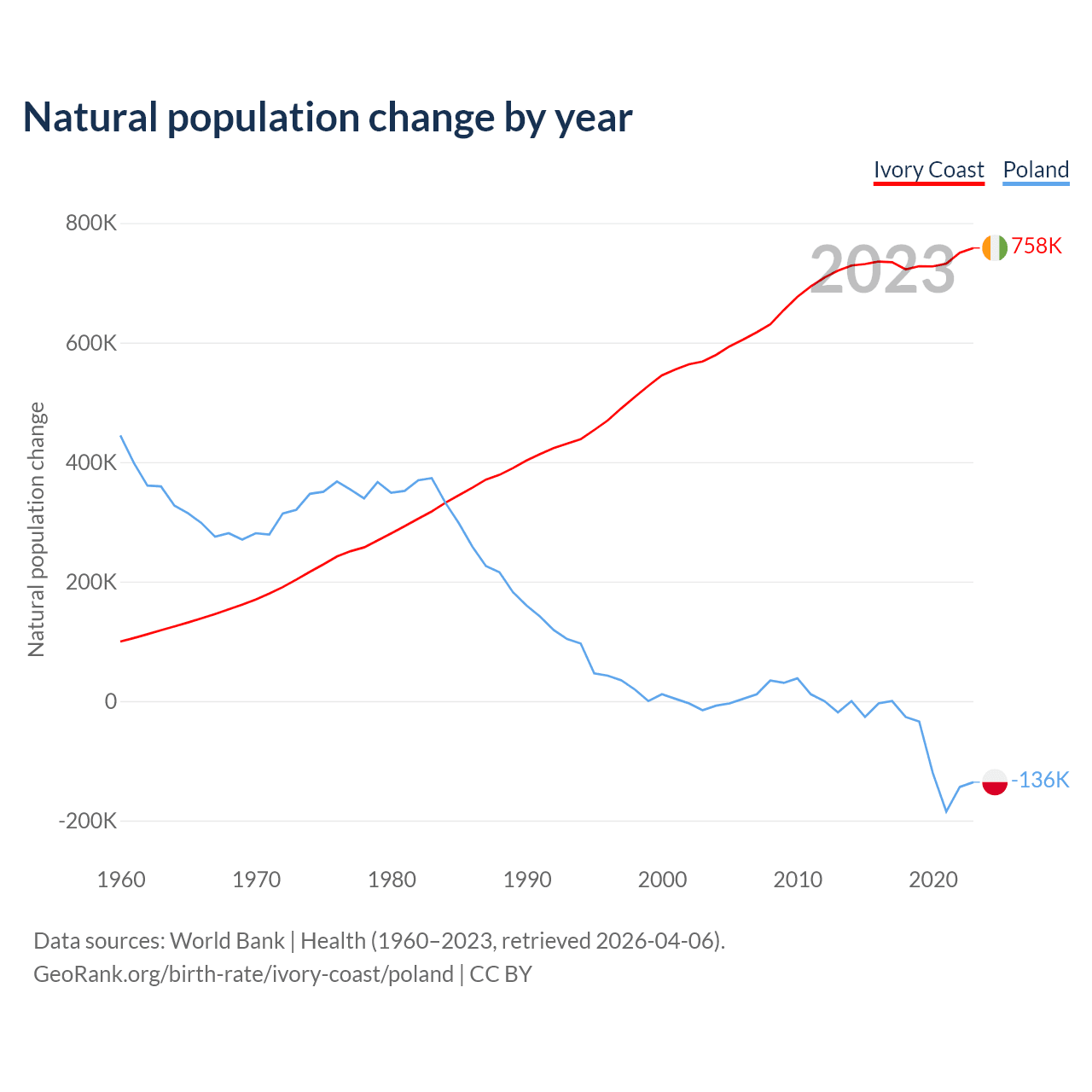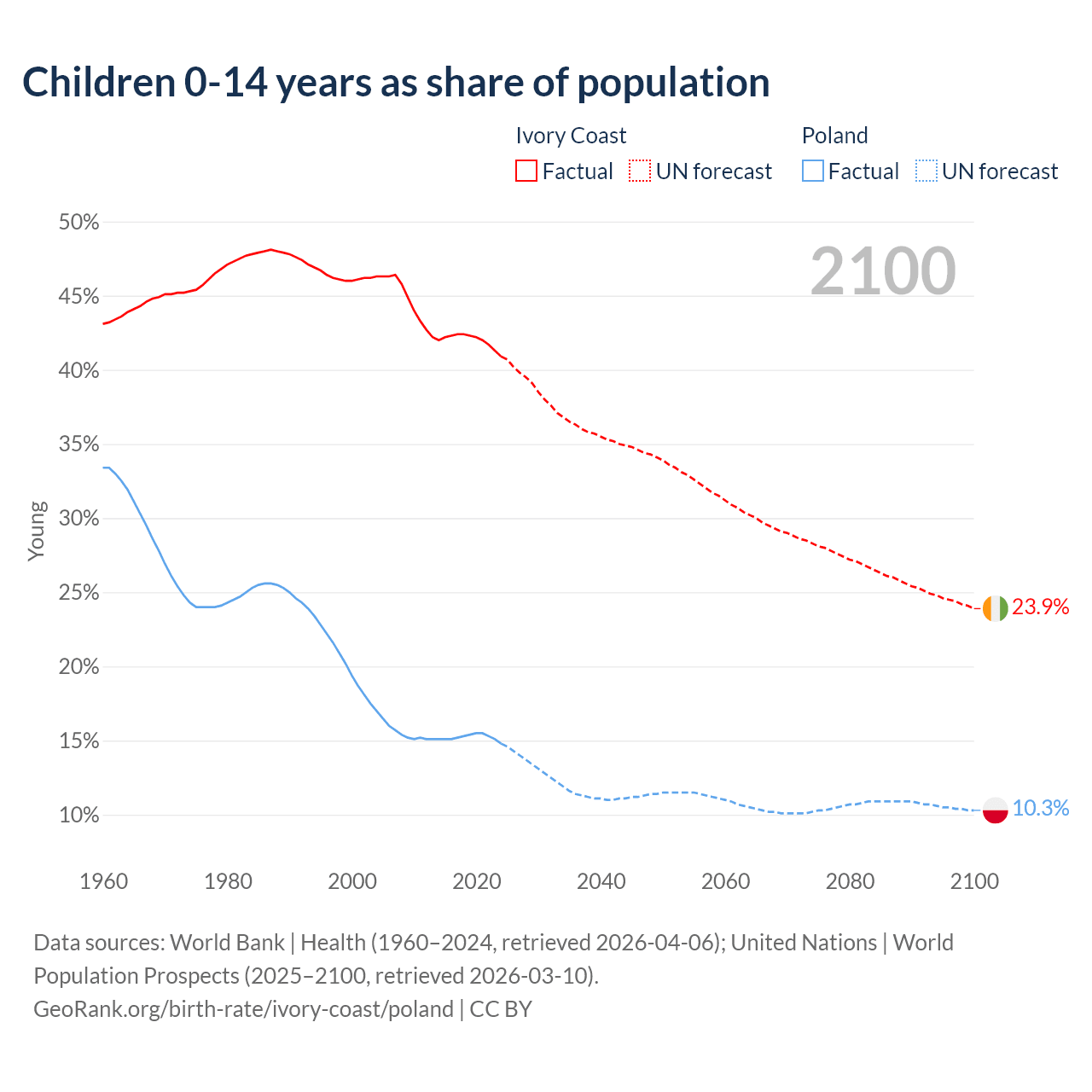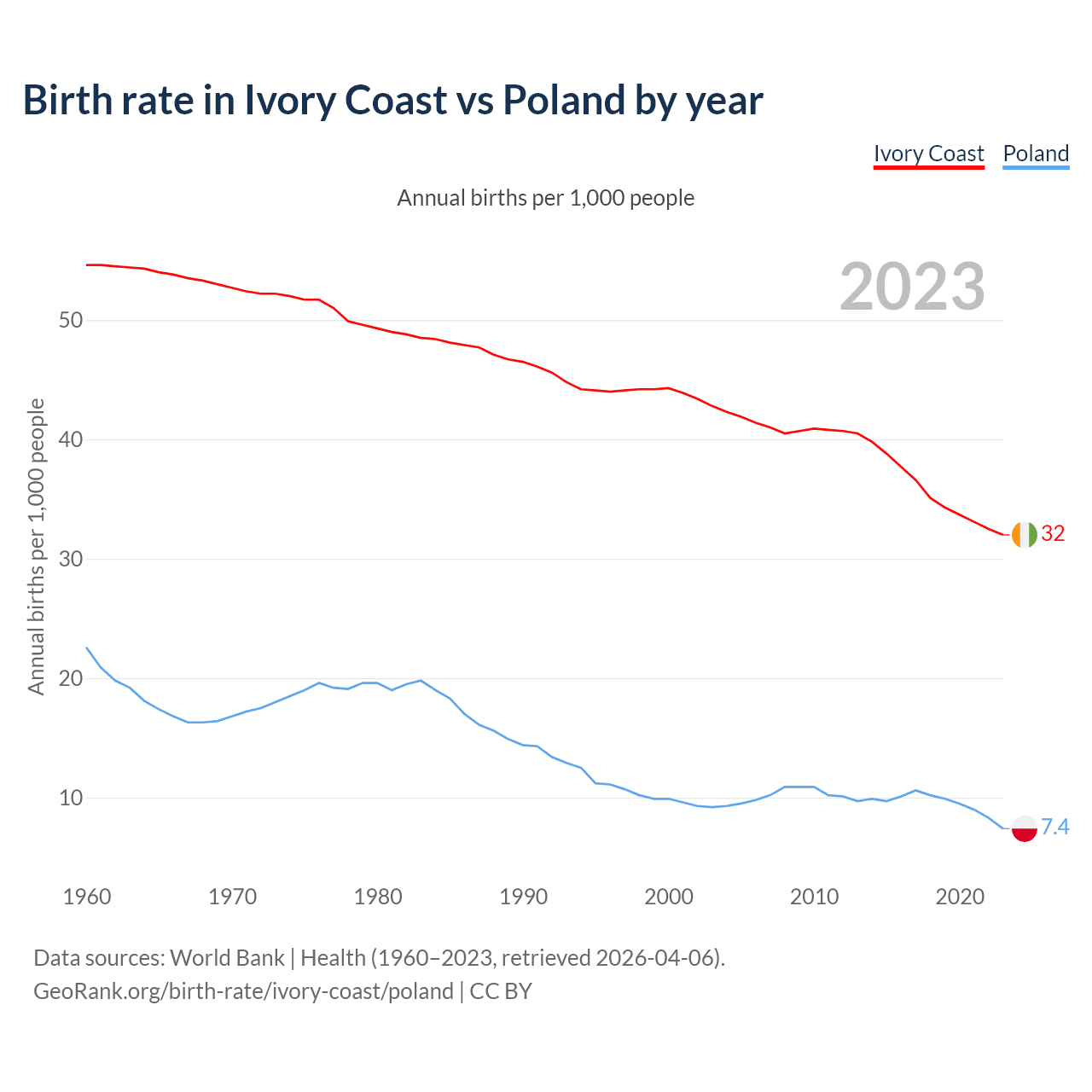 Ivory Coast has an annual birth rate of 32 births per 1,000 people, compared to 7.4 for Poland. The average number of children a woman is expected to have during her lifetime — the fertility rate, is 4.28 in Ivory Coast and 1.16 in Poland — 73% difference.