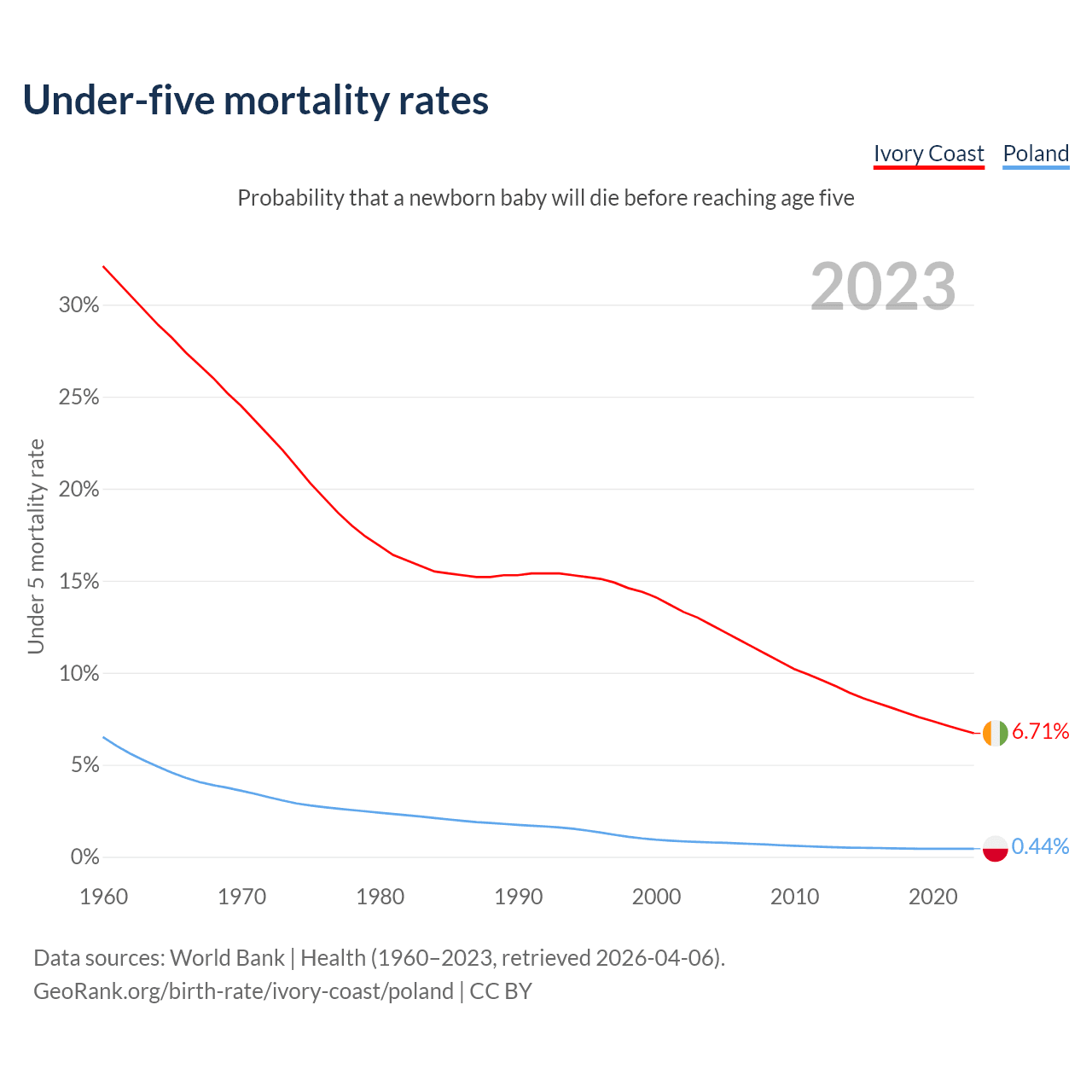 The chance that a newborn baby will die before reaching age five is 6.71% in Ivory Coast and 0.44% in Poland. Above is a chart with historical data on under-five mortality rates.