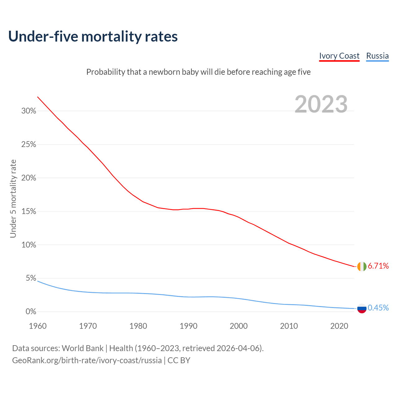 The chance that a newborn baby will die before reaching age five is 6.71% in Ivory Coast and 0.45% in Russia. Above is a chart with historical data on under-five mortality rates.