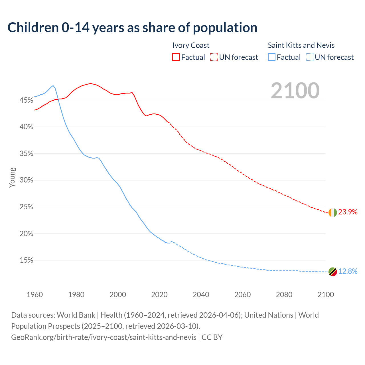 Ivory Coast has an annual birth rate of 32 births per 1,000 people, compared to 11.7 for Saint Kitts and Nevis. The average number of children a woman is expected to have during her lifetime — the fertility rate, is 4.28 in Ivory Coast and 1.51 in Saint Kitts and Nevis — 64.9% difference.