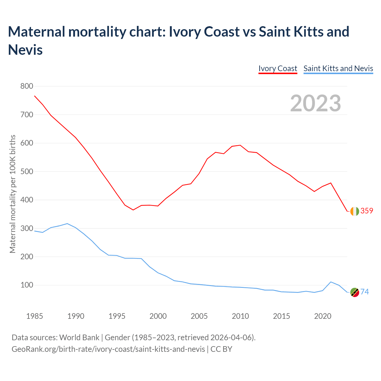 The maternal mortality rate, which is the probability of dying during childbirth or within 42 days of pregnancy termination, is 359 deaths per 100,000 live births in Ivory Coast, compared to 74 deaths in Saint Kitts and Nevis.