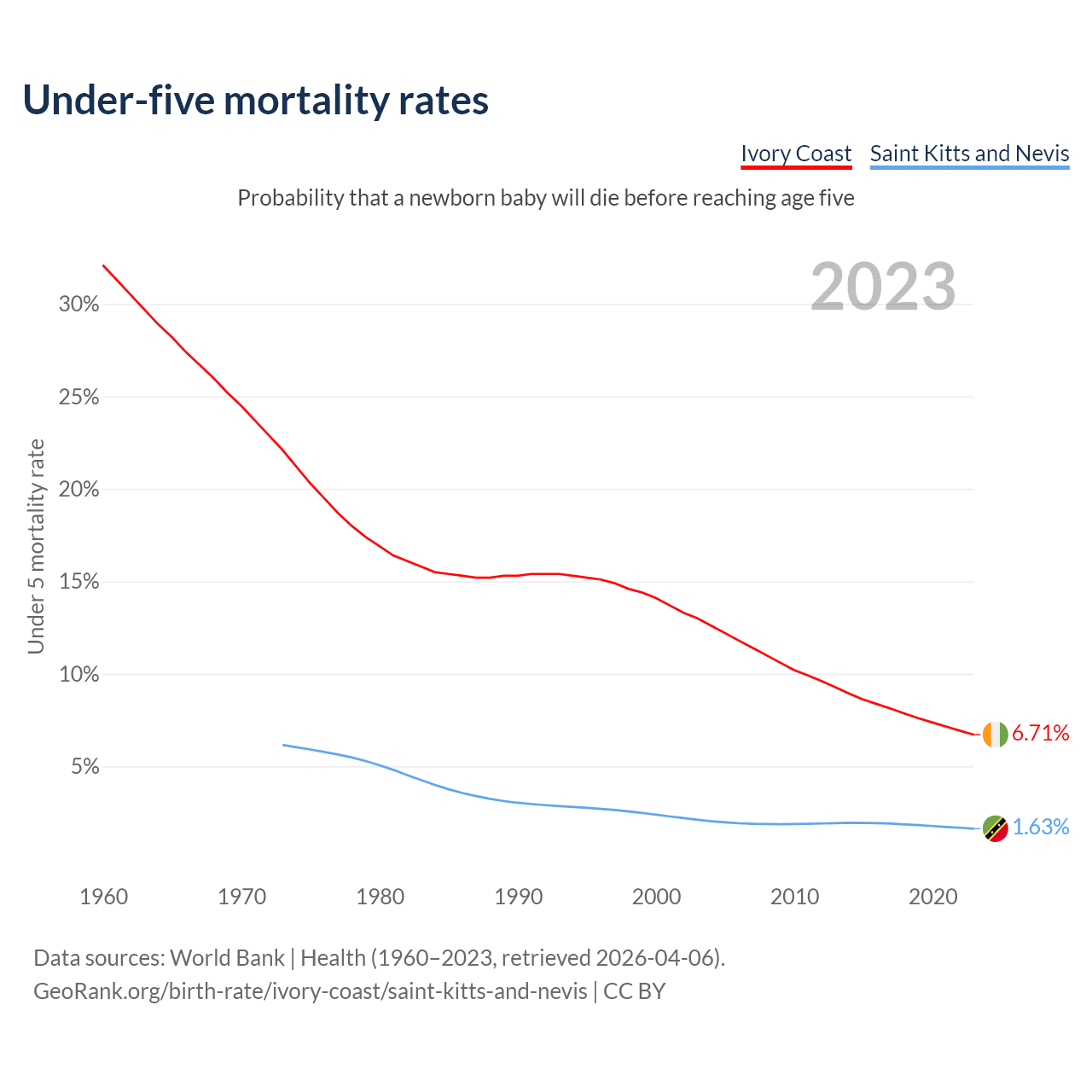 The chance that a newborn baby will die before reaching age five is 6.71% in Ivory Coast and 1.63% in Saint Kitts and Nevis. Above is a chart with historical data on under-five mortality rates.