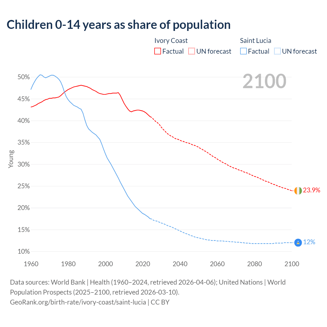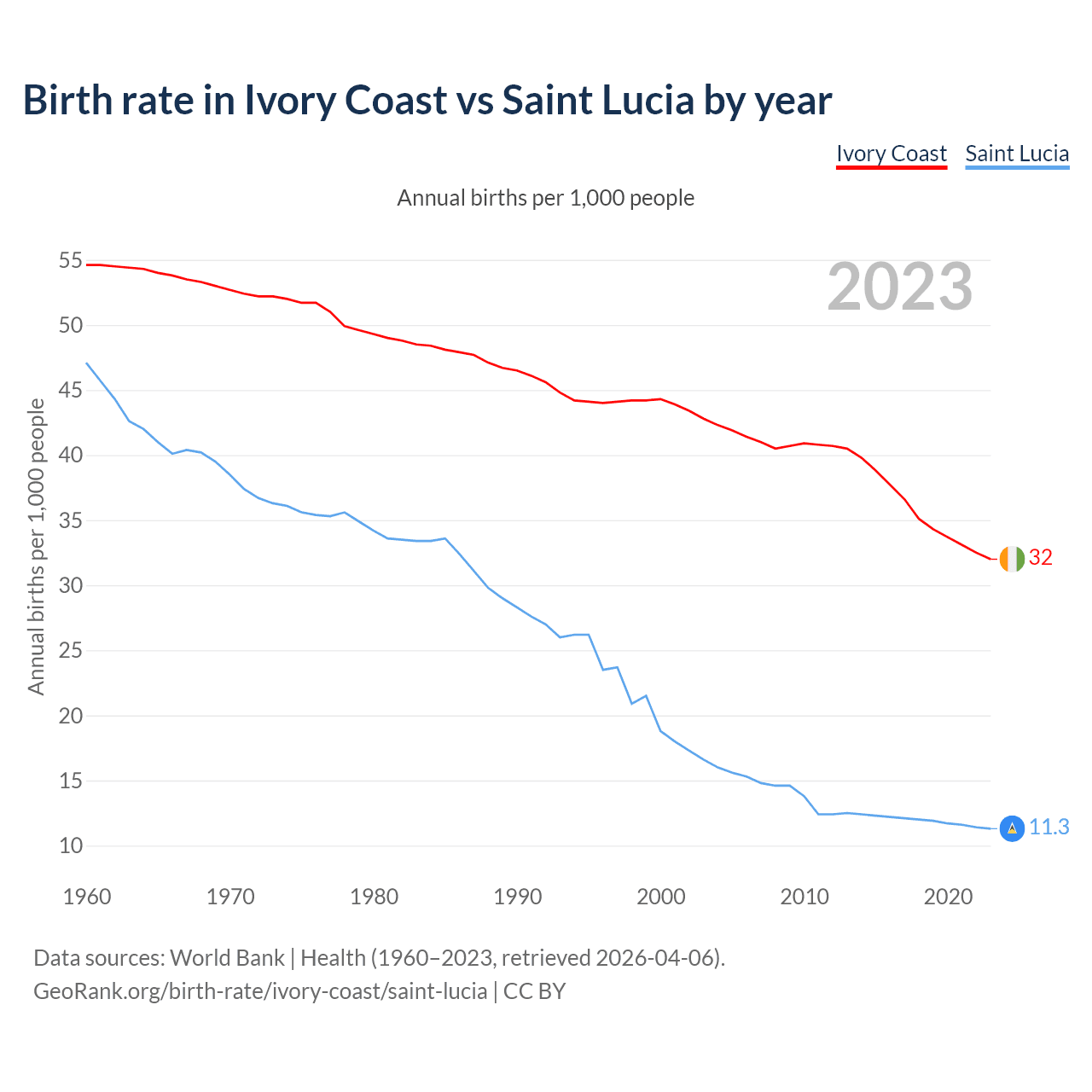 Ivory Coast has an annual birth rate of 32 births per 1,000 people, compared to 11.3 for Saint Lucia. The average number of children a woman is expected to have during her lifetime — the fertility rate, is 4.28 in Ivory Coast and 1.38 in Saint Lucia — 67.8% difference.