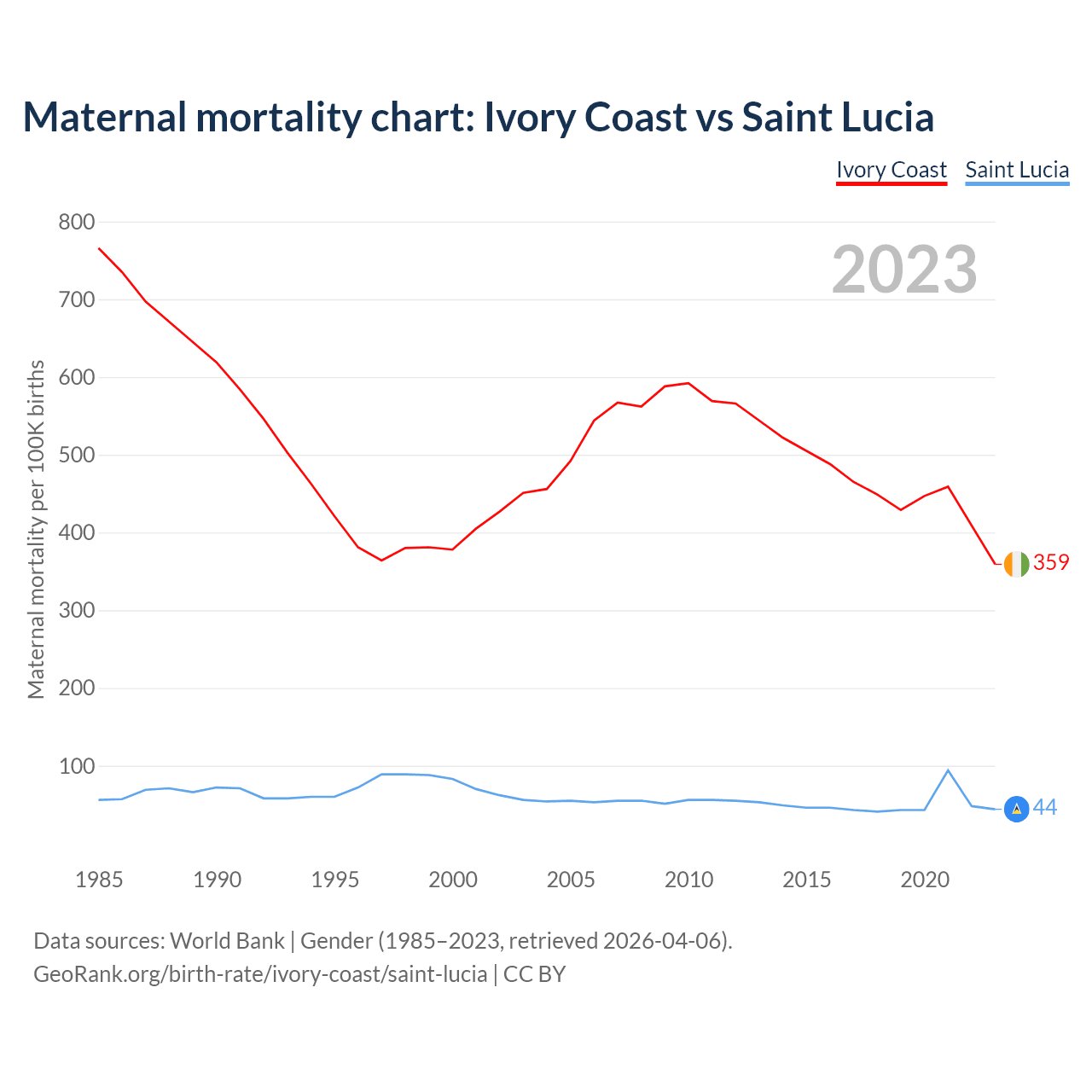 The maternal mortality rate, which is the probability of dying during childbirth or within 42 days of pregnancy termination, is 359 deaths per 100,000 live births in Ivory Coast, compared to 44 deaths in Saint Lucia.