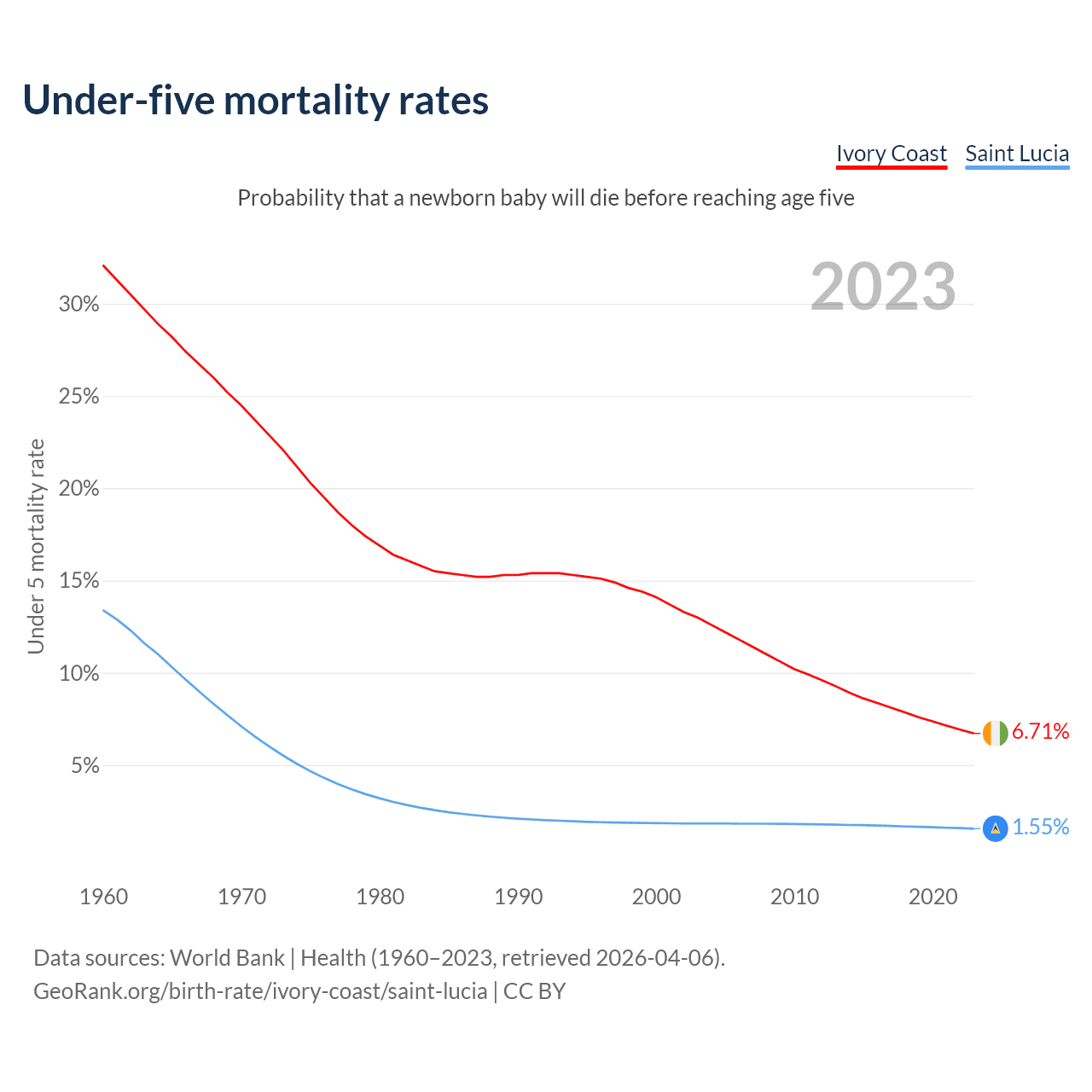 The chance that a newborn baby will die before reaching age five is 6.71% in Ivory Coast and 1.55% in Saint Lucia. Above is a chart with historical data on under-five mortality rates.