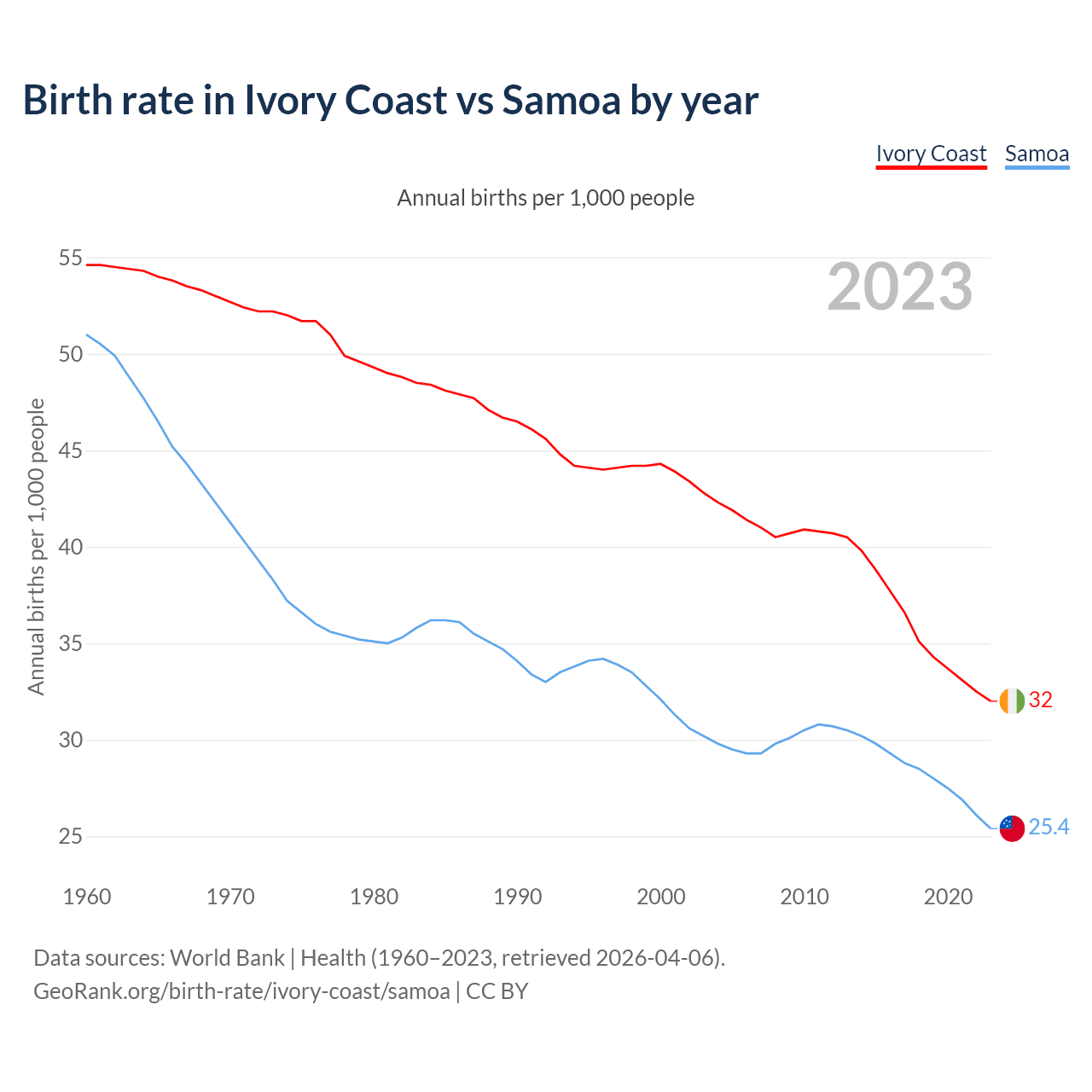 Ivory Coast has an annual birth rate of 32 births per 1,000 people, compared to 25.4 for Samoa. The average number of children a woman is expected to have during her lifetime — the fertility rate, is 4.28 in Ivory Coast and 3.83 in Samoa — 10.6% difference.