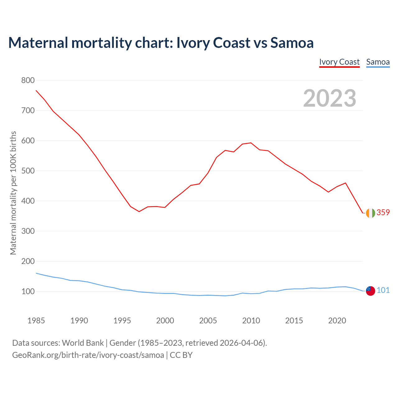 The maternal mortality rate, which is the probability of dying during childbirth or within 42 days of pregnancy termination, is 359 deaths per 100,000 live births in Ivory Coast, compared to 101 deaths in Samoa.