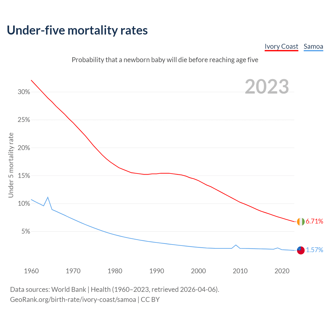 The chance that a newborn baby will die before reaching age five is 6.71% in Ivory Coast and 1.57% in Samoa. Above is a chart with historical data on under-five mortality rates.