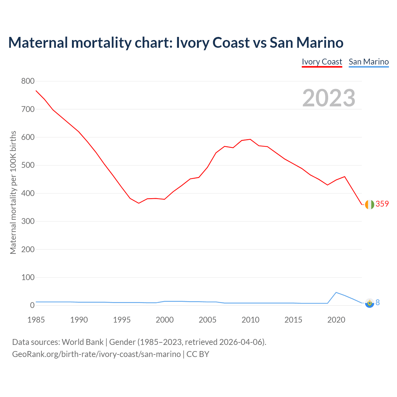 The maternal mortality rate, which is the probability of dying during childbirth or within 42 days of pregnancy termination, is 359 deaths per 100,000 live births in Ivory Coast, compared to 8 deaths in San Marino.