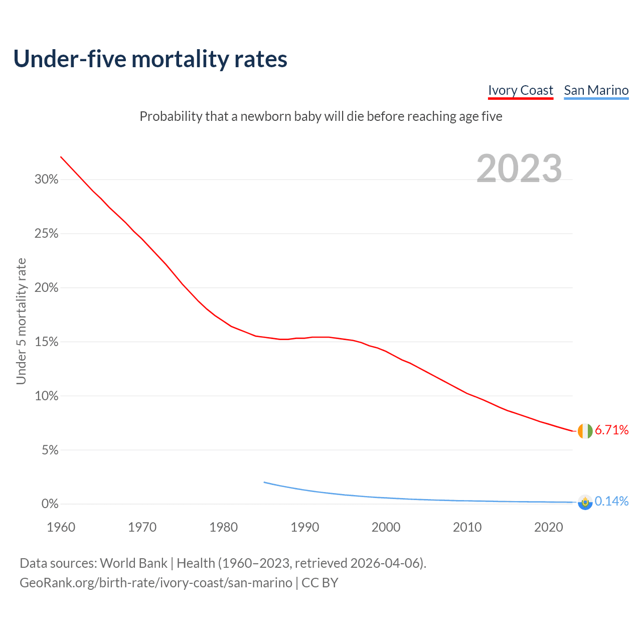The chance that a newborn baby will die before reaching age five is 6.71% in Ivory Coast and 0.14% in San Marino. Above is a chart with historical data on under-five mortality rates.