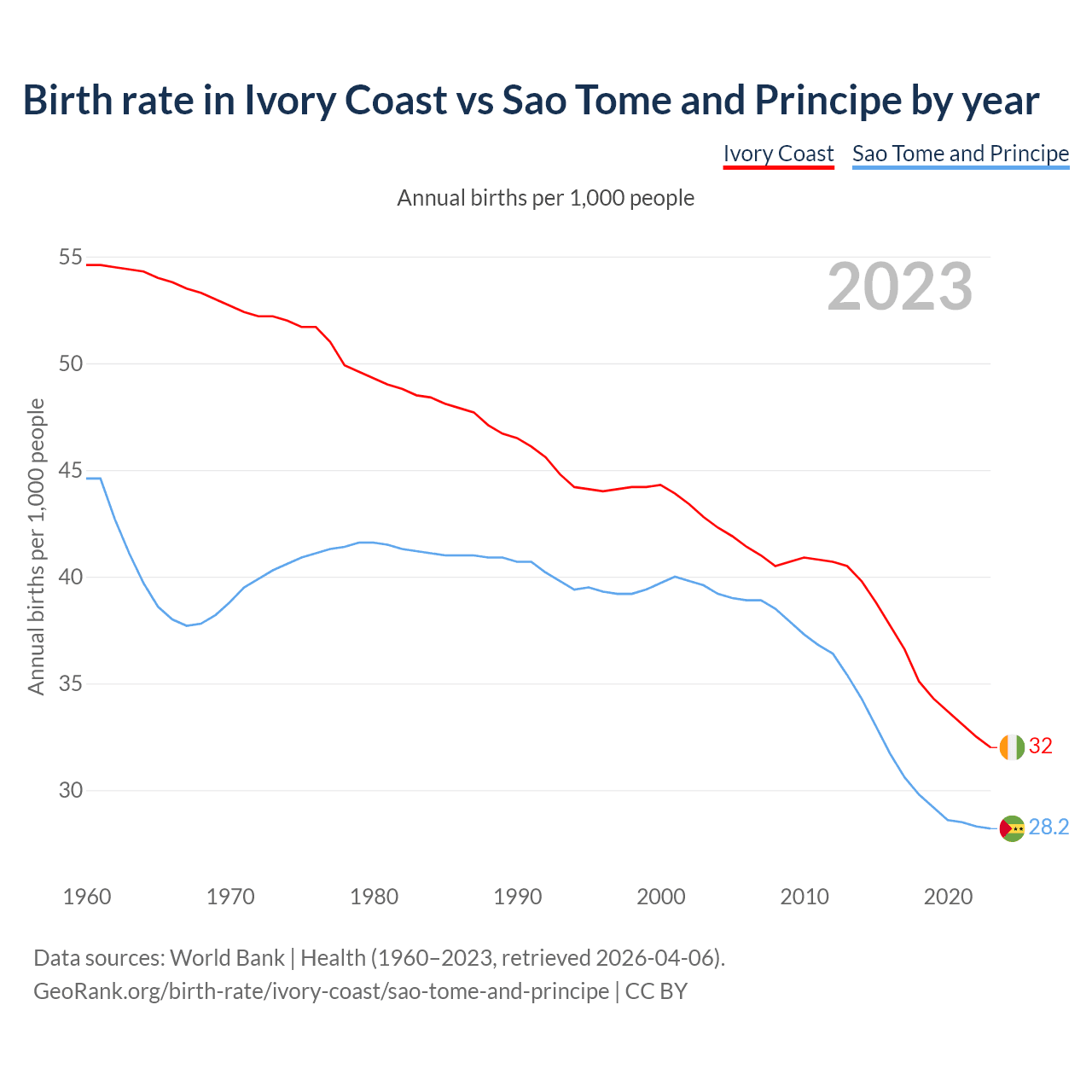 Ivory Coast has an annual birth rate of 32 births per 1,000 people, compared to 28.2 for Sao Tome and Principe. The average number of children a woman is expected to have during her lifetime — the fertility rate, is 4.28 in Ivory Coast and 3.64 in Sao Tome and Principe — 14.9% difference.