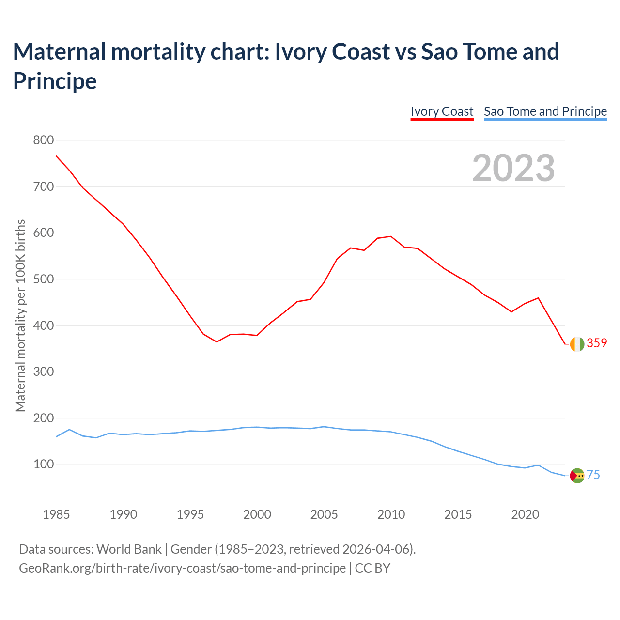 The maternal mortality rate, which is the probability of dying during childbirth or within 42 days of pregnancy termination, is 359 deaths per 100,000 live births in Ivory Coast, compared to 75 deaths in Sao Tome and Principe.