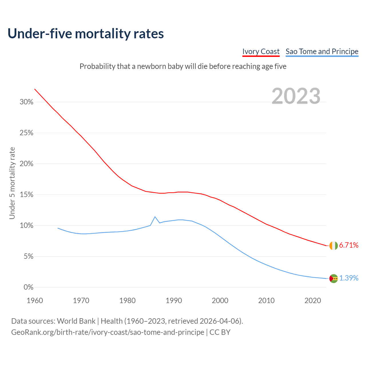 The chance that a newborn baby will die before reaching age five is 6.71% in Ivory Coast and 1.39% in Sao Tome and Principe. Above is a chart with historical data on under-five mortality rates.