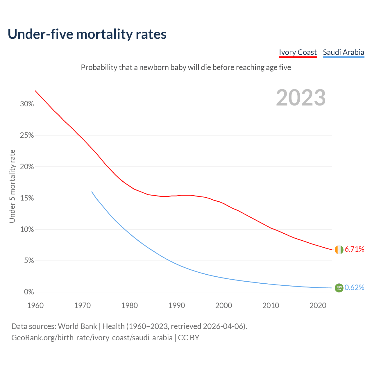 The chance that a newborn baby will die before reaching age five is 6.71% in Ivory Coast and 0.62% in Saudi Arabia. Above is a chart with historical data on under-five mortality rates.