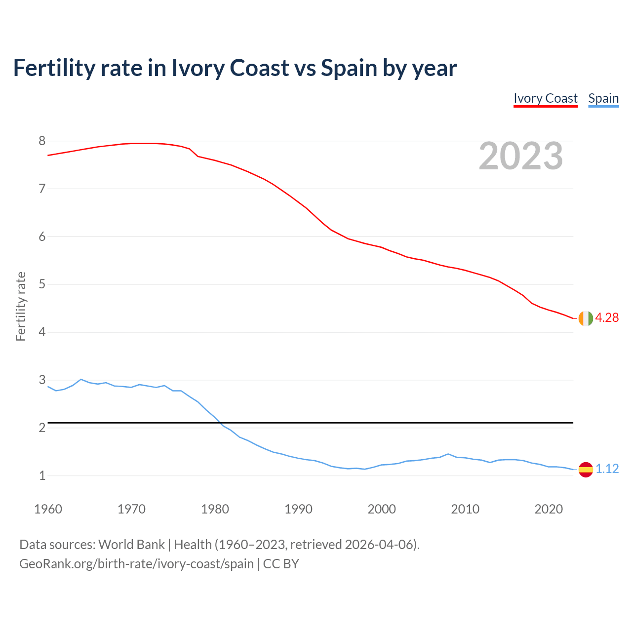 1960 vs 2023, the fertility rate has decreased by 44.3% in Ivory Coast and by 60.8% in Spain — in 1960, it was 7.69 and 2.86, respectively.