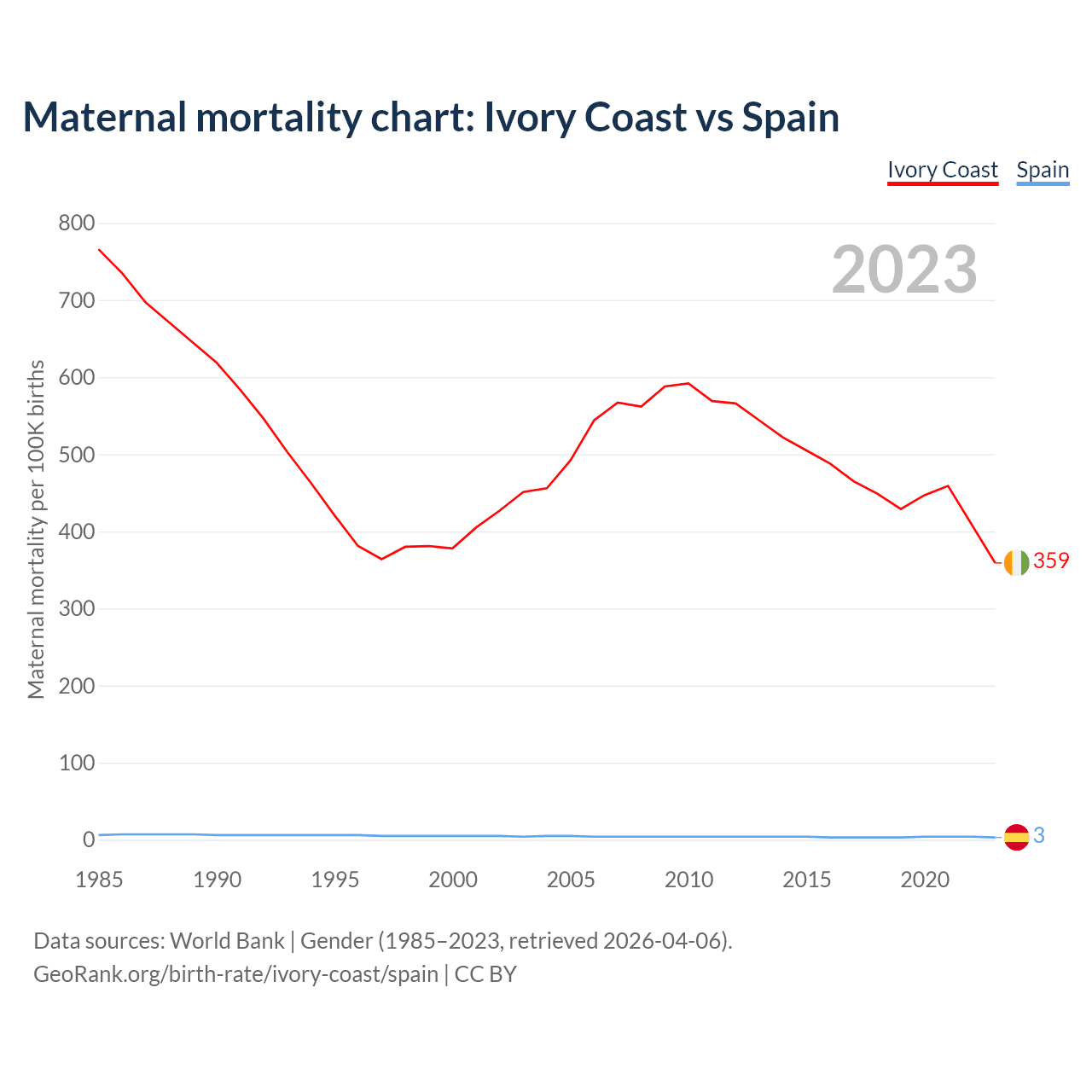 The maternal mortality rate, which is the probability of dying during childbirth or within 42 days of pregnancy termination, is 359 deaths per 100,000 live births in Ivory Coast, compared to 3 deaths in Spain.