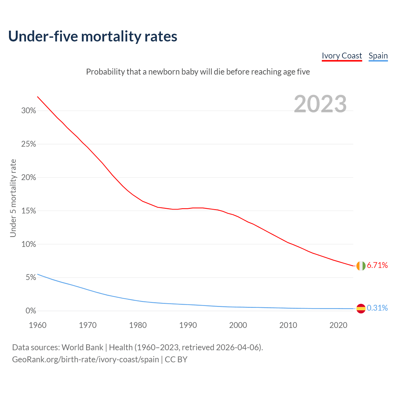 The chance that a newborn baby will die before reaching age five is 6.71% in Ivory Coast and 0.31% in Spain. Above is a chart with historical data on under-five mortality rates.
