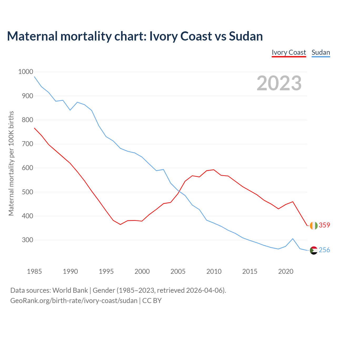 The maternal mortality rate, which is the probability of dying during childbirth or within 42 days of pregnancy termination, is 359 deaths per 100,000 live births in Ivory Coast, compared to 256 deaths in Sudan.