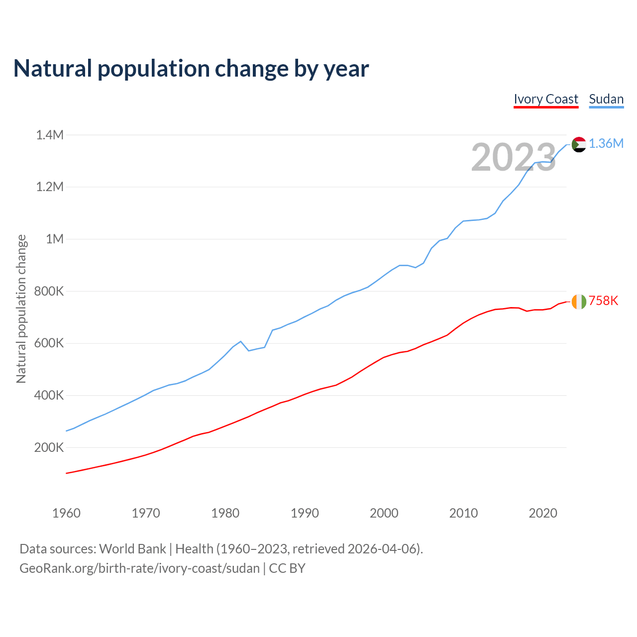 Ivory Coast has an annual birth rate of 32 births per 1,000 people, compared to 33.6 for Sudan. The average number of children a woman is expected to have during her lifetime — the fertility rate, is 4.28 in Ivory Coast and 4.32 in Sudan — 0.93% difference.