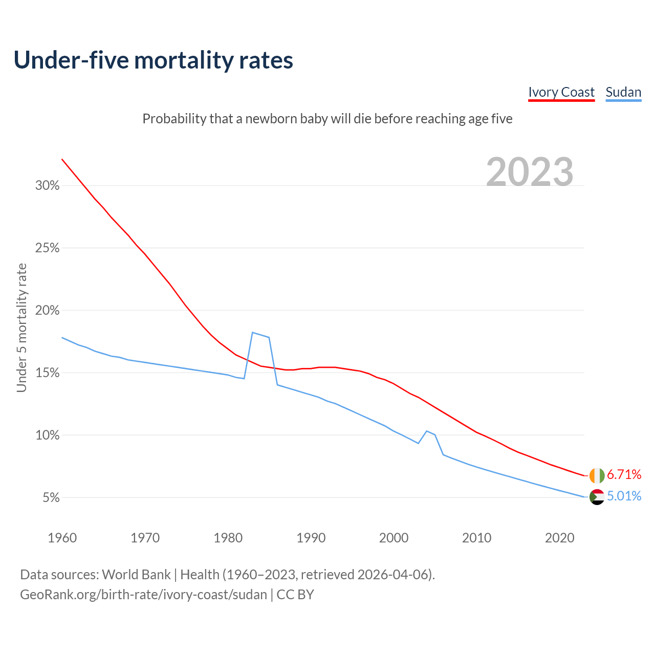 The chance that a newborn baby will die before reaching age five is 6.71% in Ivory Coast and 5.01% in Sudan. Above is a chart with historical data on under-five mortality rates.