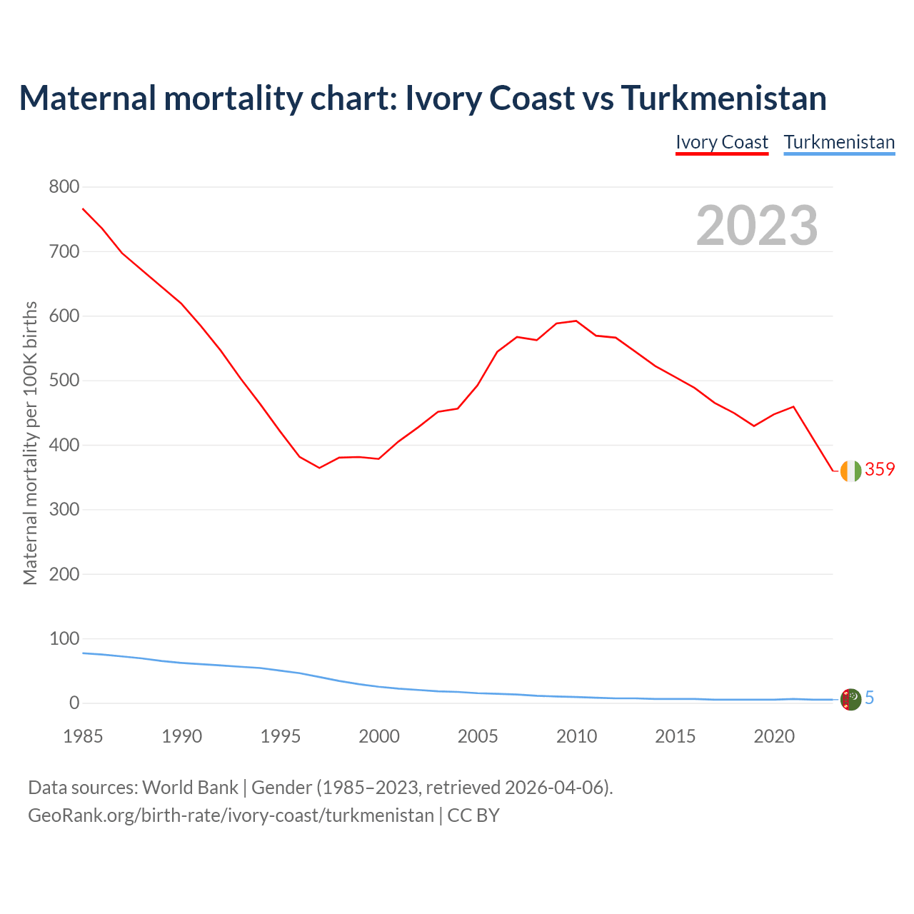 The maternal mortality rate, which is the probability of dying during childbirth or within 42 days of pregnancy termination, is 359 deaths per 100,000 live births in Ivory Coast, compared to 5 deaths in Turkmenistan.