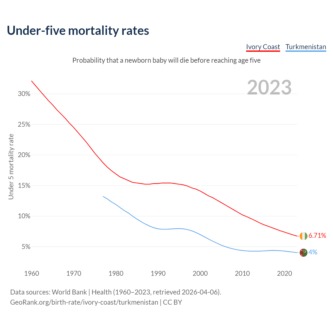 The chance that a newborn baby will die before reaching age five is 6.71% in Ivory Coast and 4% in Turkmenistan. Above is a chart with historical data on under-five mortality rates.
