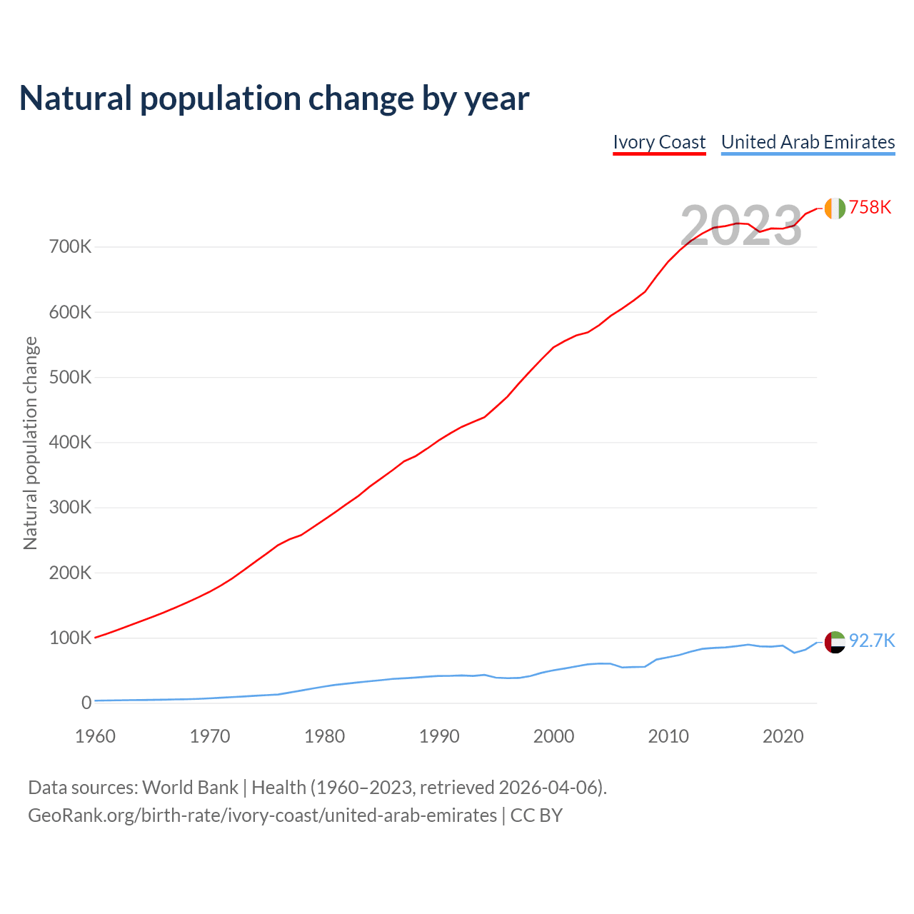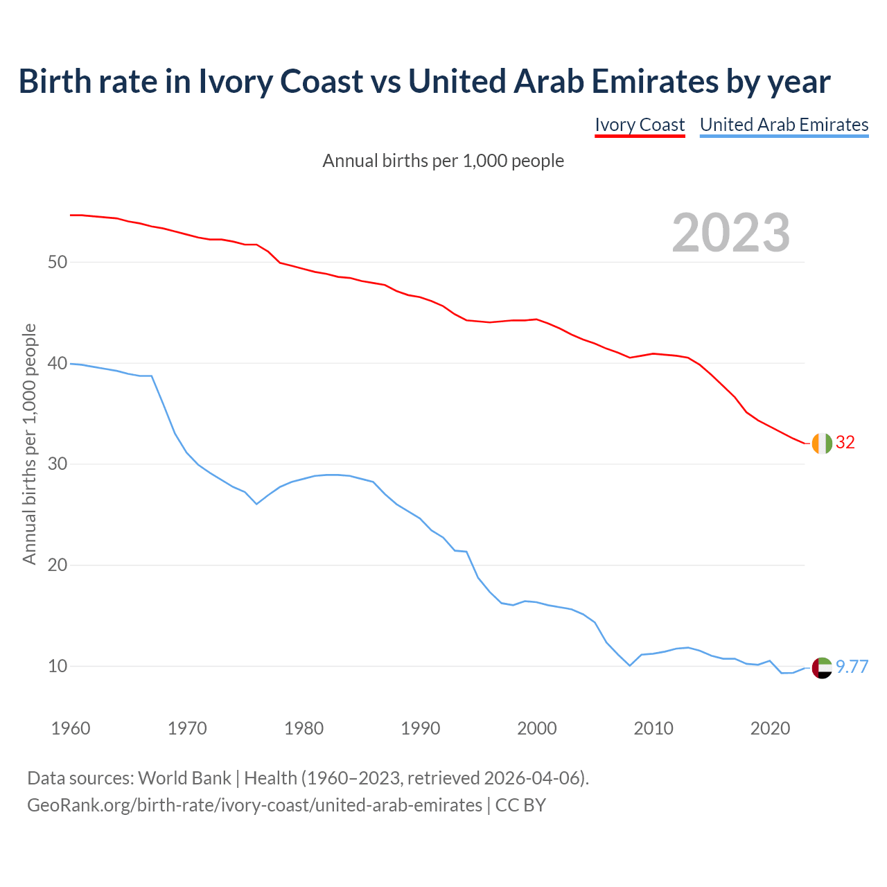 Ivory Coast has an annual birth rate of 32 births per 1,000 people, compared to 9.77 for the United Arab Emirates. The average number of children a woman is expected to have during her lifetime — the fertility rate, is 4.28 in Ivory Coast and 1.2 in the United Arab Emirates — 72% difference.