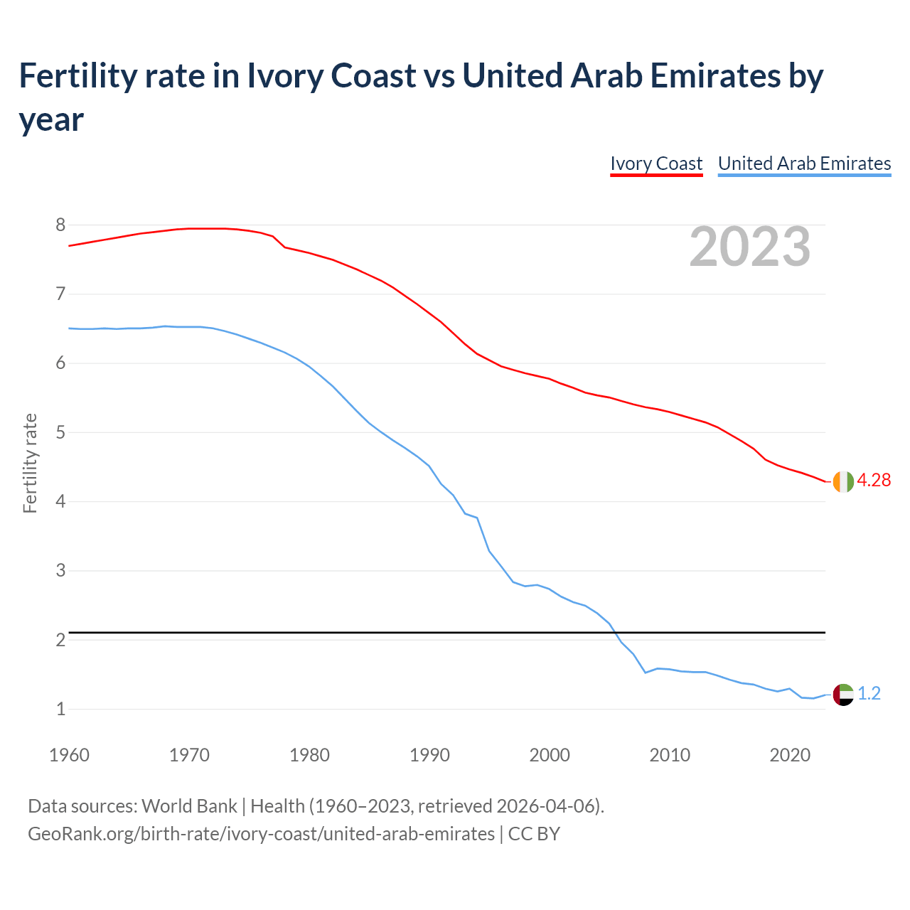According to the latest available data on birth rates, the fertility rate in Ivory Coast was 4.28 children per woman in 2023, compared to 1.2 in the United Arab Emirates in 2023. The replacement level is considered to be 2.1 children per woman.